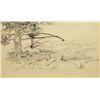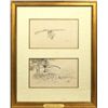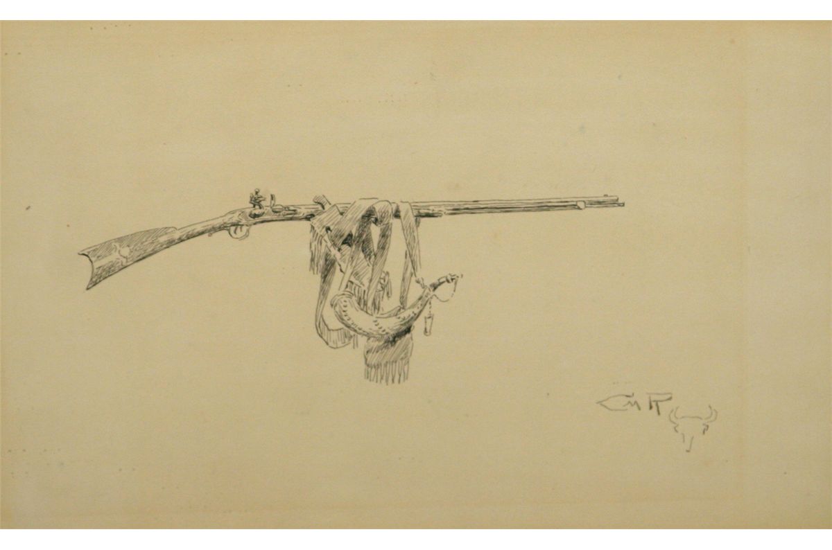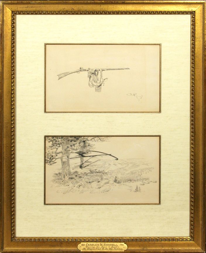 Charles M. Russell (1864 - 1926). Drawings for Agnes C. Laut's The Blazed Trail Of The Old Frontier. Pair 6.5" x 10.5" pen & inks framed together. Upper drawing signed lower right: CMR [skull]. Provenance: Collection of Dr. Delwin & Karen Bokelman, PA. Includes a copy of Agnes C. Laut's book The Blazed Trail Of The Old Frontier. A copy of the Frederic Renner letter is included. Condition reports can be viewed at www.marchinmontana.com/docs/2013CR.pdf