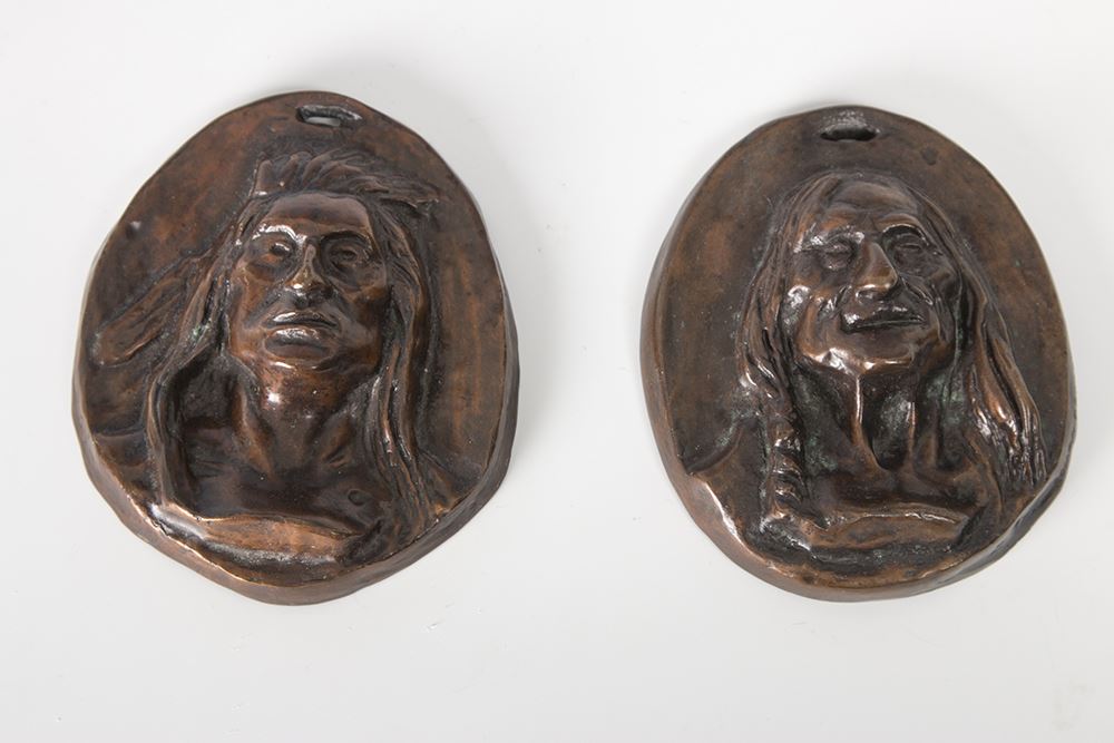 Charles Marion Russell (1864-1926). Young Man and Old Man. Pair of brass Indian plaques. Each 4½" x 3½" bronze. Each inscribed: CM Russell (skull) 1898 Roman Bronze Works, Inc. NY.