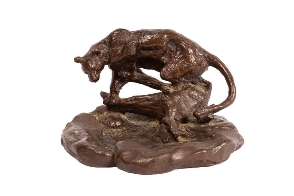 "Ready for the Kill" by Charles M. Russell, modeled 1909, cast 1940’s. 3 1/4" tall by 6 1/2" wide by 6" deep. Cast #4, from edition of 9, by Homer E. Britzman Nelli Art Bronze Foundry L.A.