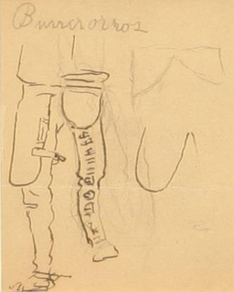 Charles M. Russell (1865-1926). Mexican Chaps. 4 ½" x 3 ?" pen & ink. Estate stamped verso. Ginger Renner letter included. (est $2,000-3,000) Condition Report: Paper slightly discolored from age, otherwise fine condition. Nicely matted and framed