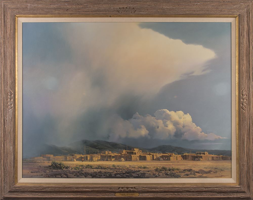 Charles Pabst (1950 - ). Taos Storm. 36" x 48" oil on canvas. Signed lower right. Verso: El Prisidio Gallery, Tucson, AZ sticker stating title, size, medium, and S-293. Also titled on frame.