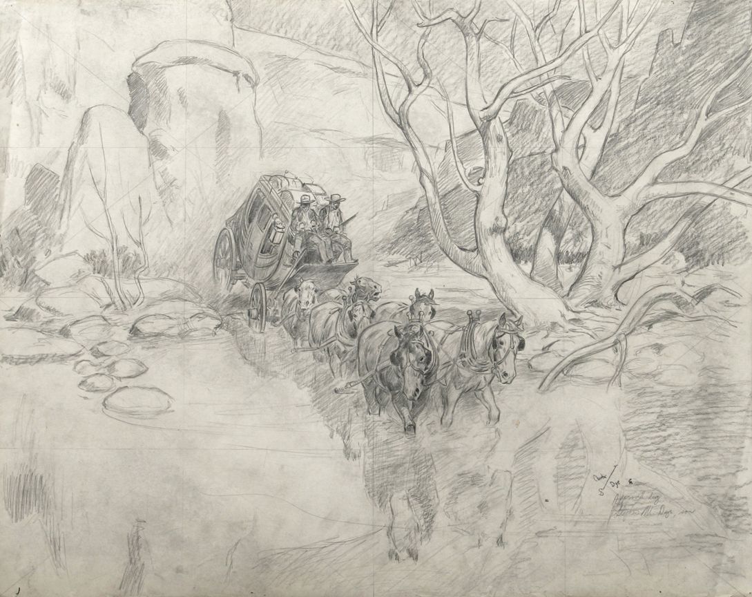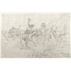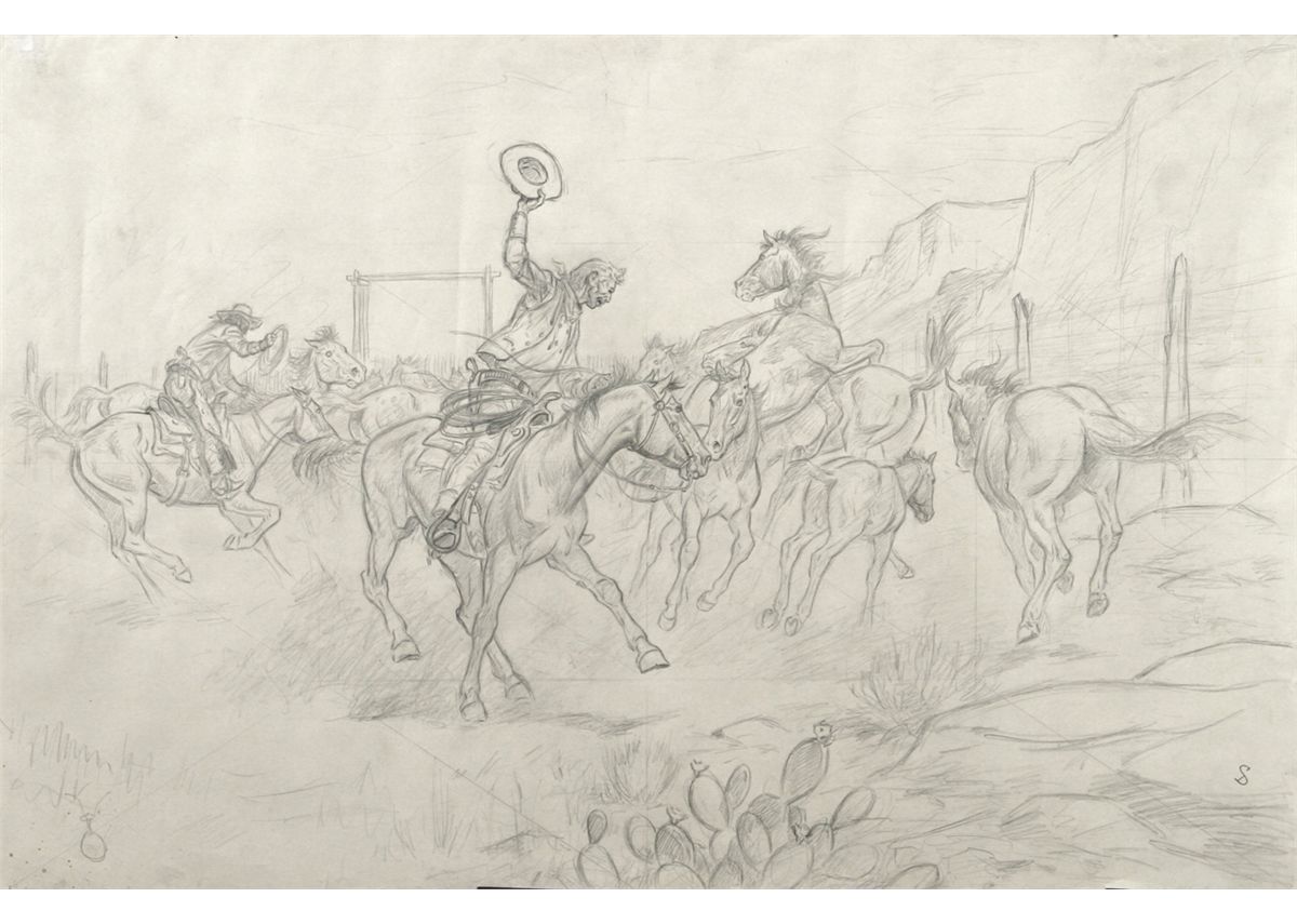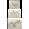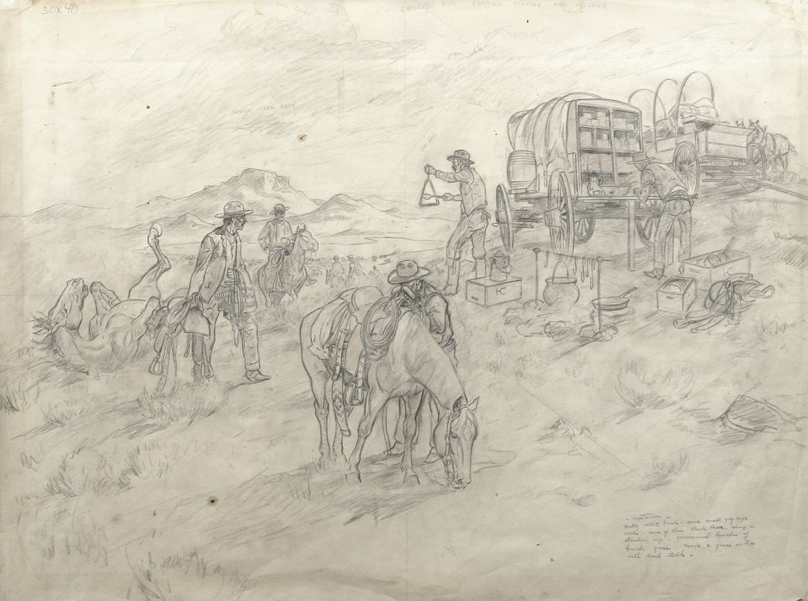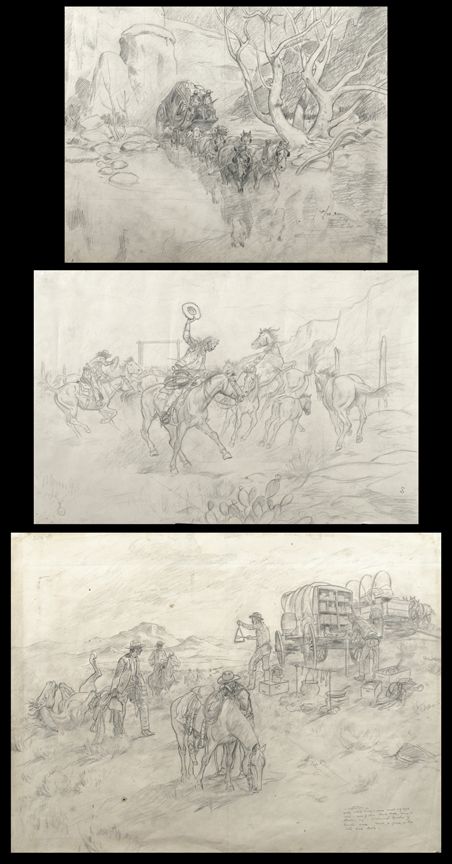 Charlie Dye (1906 - 1972). Sycamore Crossing. 24" x 30" pencil on paper. Estate stamp lower right. Inscribed in pencil lower right: Approved by Stephen M. Dye, son. Rustlin'. 23.5" x 35.75" pencil on paper. Signed lower right: CD. Dinner Music. 30" x 40" pencil on paper. Unsigned. Provenance: Nevada Museum of Art, Reno, Nevada. Condition reports can be viewed at www.marchinmontana.com/docs/2013CR.pdf