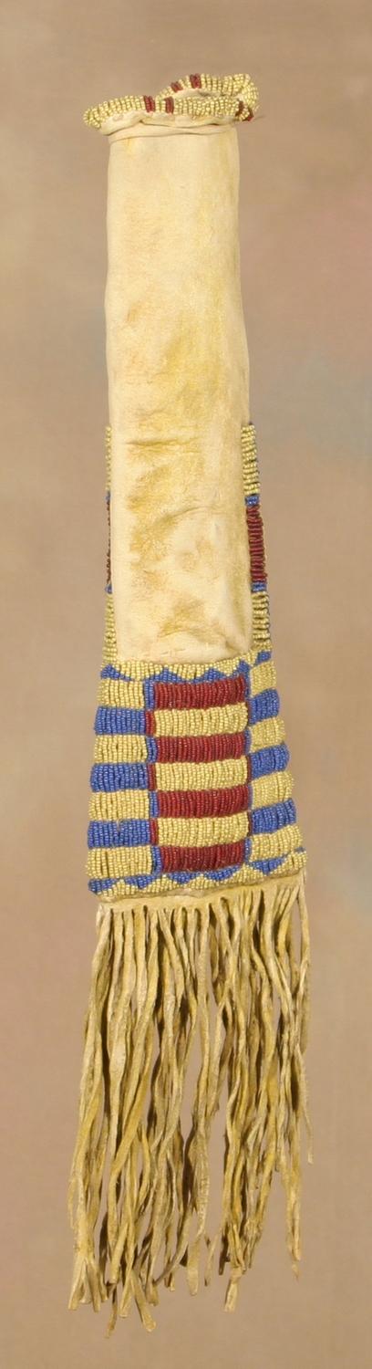 Cheyenne Beaded Bar Bag. Highly collectible design. 21" x 5". 19th century, fine condition. (est $3,500-4,500) Condition Report: Yellow oche dye visible. Beadwork all intact. Generally excellent