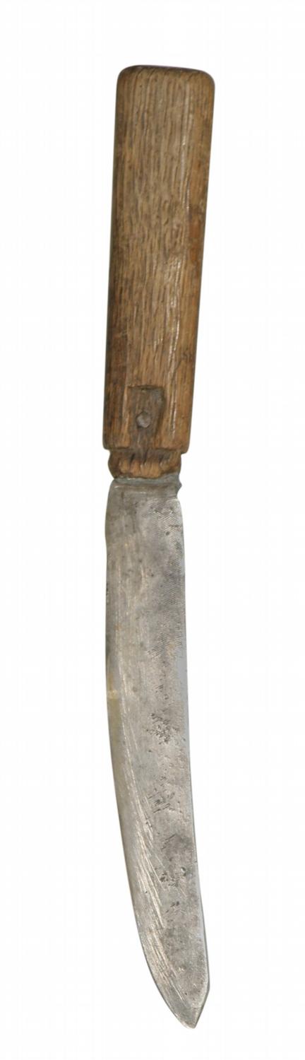 Cheyenne Beaded Knife Sheath with Knife. 10" x 3". Knife is 12" long & is made from an old file. 19th century. (est $1,500-2,500) Condition Report: Knife blade and handle both show use and age. Sheath in very good condition with excellent beadwork