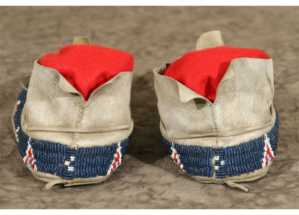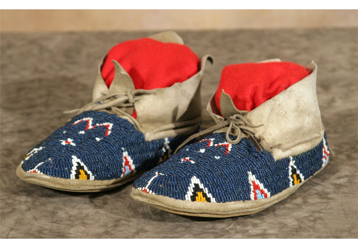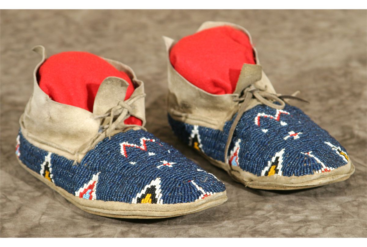Cheyenne Moccasins. 9.5" long. Fully beaded vamp & heal band in an unusual color scheme. Rare double welt. Circa 1910. Condition reports can be viewed at www.marchinmontana.com/docs/2013CR.pdf