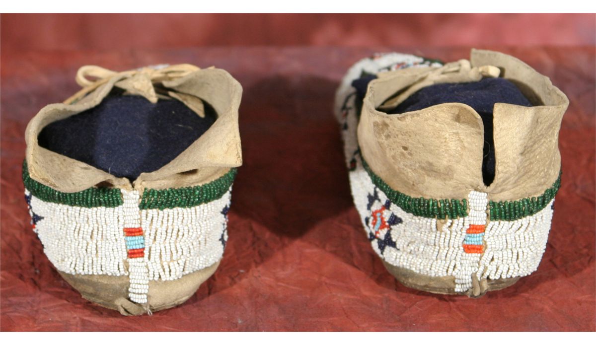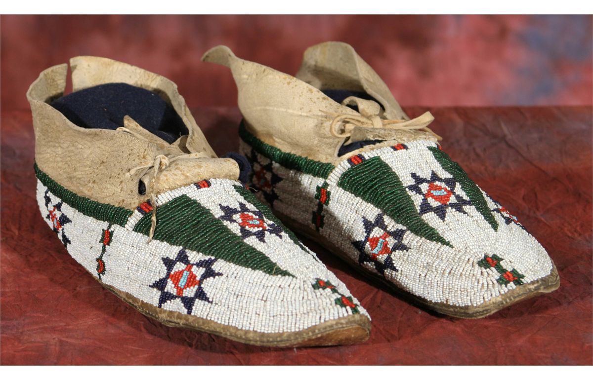 Cheyenne Moccasins. 10.5" long. Fully beaded in Classic designs & colors. 19th century. Provenance: Collection of Dr. Delwin & Karen Bokelman, PA. Condition reports can be viewed at www.marchinmontana.com/docs/2013CR.pdf