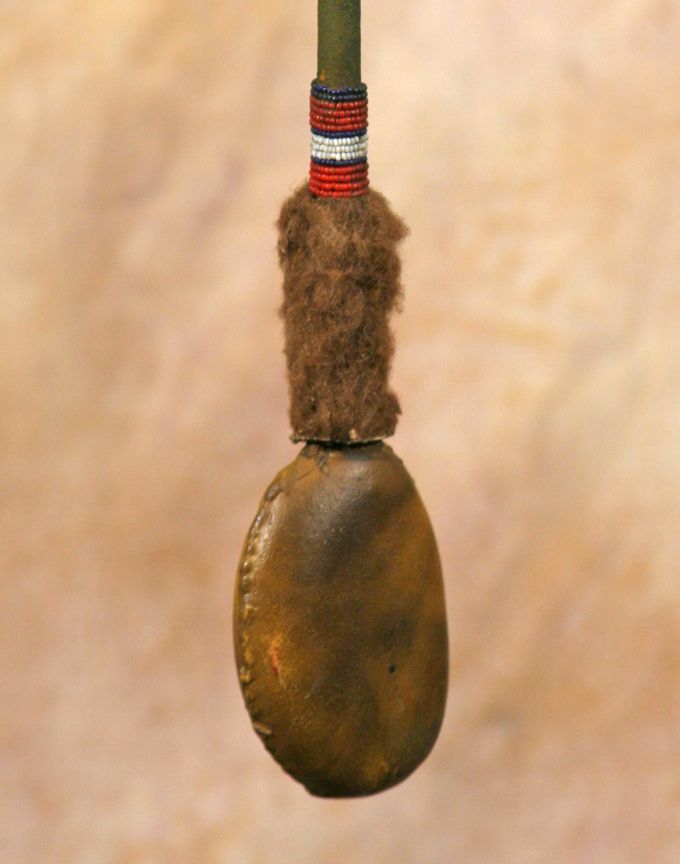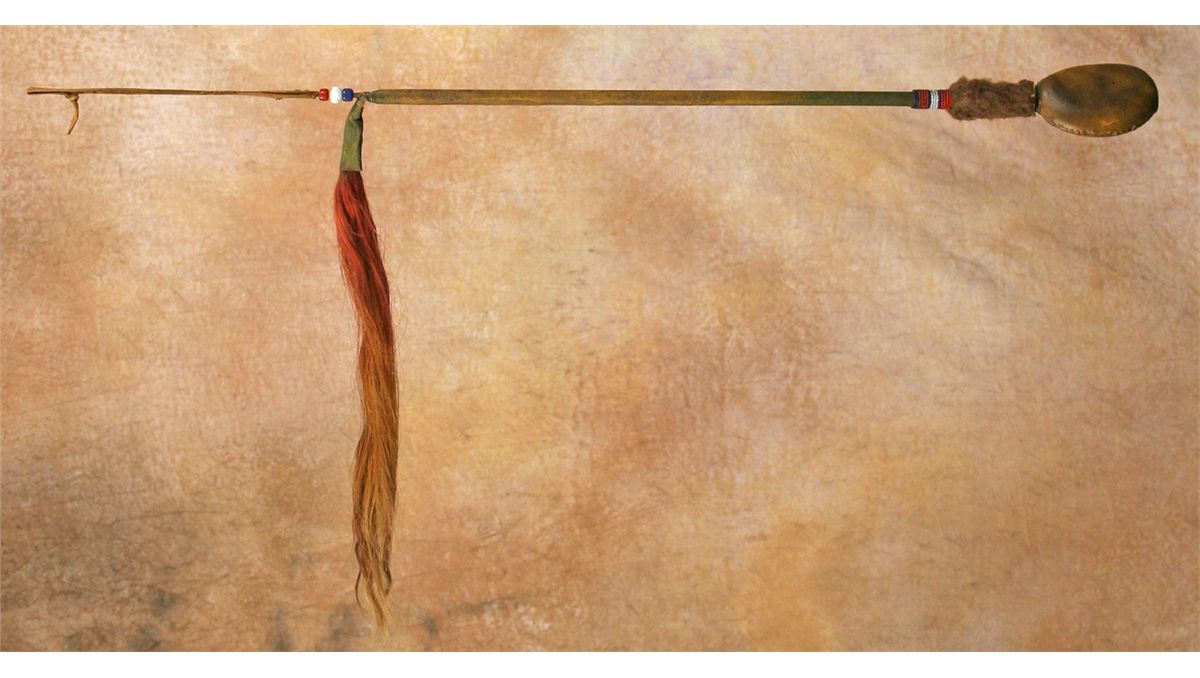 Cheyenne Floppy Head War Club. 4" x 3" hide-covered stone head. 19" hide-covered haft with remnants of green ochre. Decorated at the top with buffalo hide & beadwork. 16" red dyed horsehair drop, accented with three large beads and two hide tassels. 19th century. Condition reports can be viewed at www.marchinmontana.com/docs/2013CR.pdf