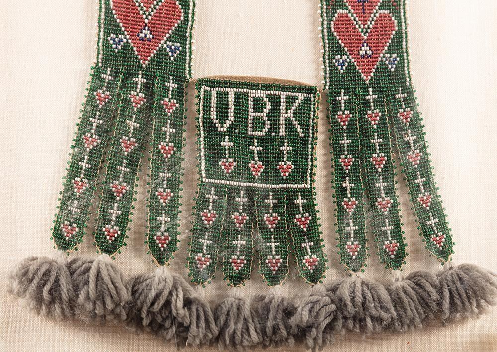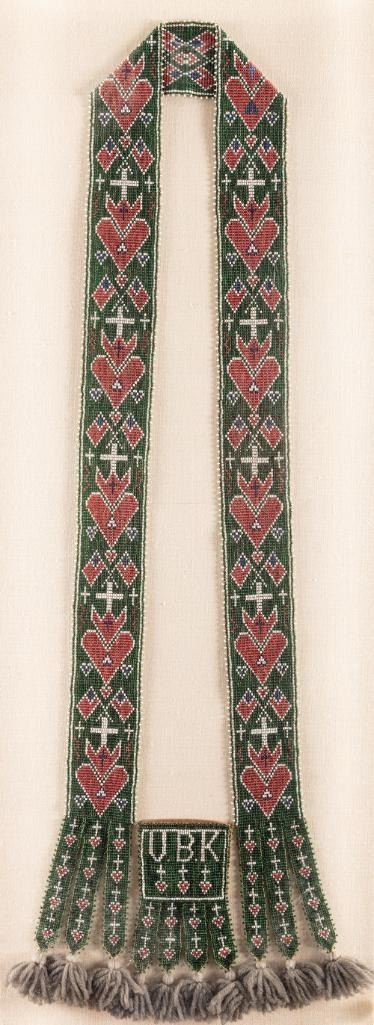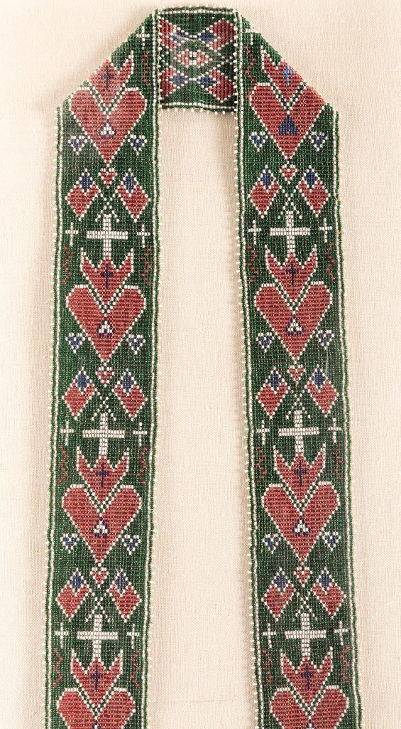30" x 11" overall with "UBK" initials beaded into the bag. Accented with grey yarn drops and beaded in intricate patterns of hearts, flags and crosses. Late 19th century.
