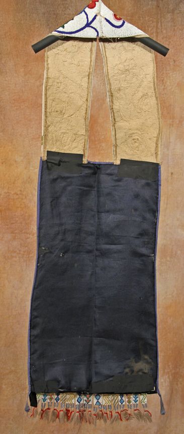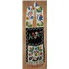 Chippewa Bandolier Bag. 41" x 14". Beautiful floral motif in a multitude of solid, translucent & faceted beads. Velveteen pouch with canvas backing & canvas strap. Loom beaded tabs with wool tassels finish off the bottom. 19th century. Condition reports can be viewed at www.marchinmontana.com/docs/2013CR.pdf
