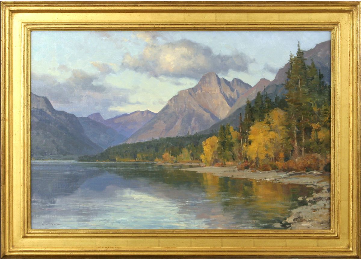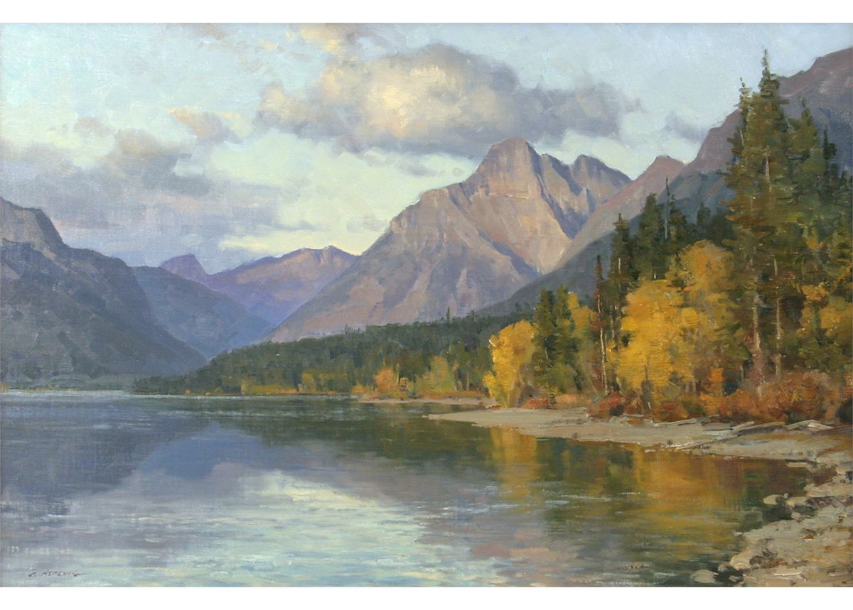 Clyde Aspevig (1951 - ). Lake McDonald. 20" x 30" oil on board. Signed lower left: C. ASPEVIG. Condition reports can be viewed at www.marchinmontana.com/docs/2013CR.pdf