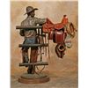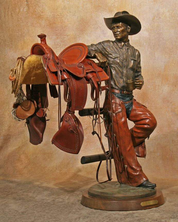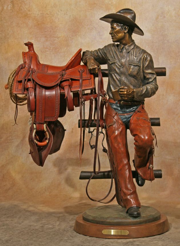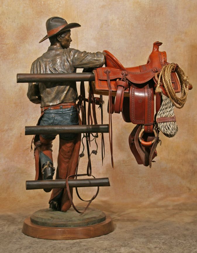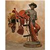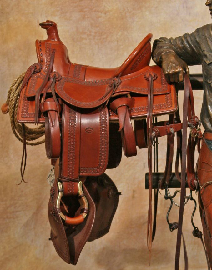 Clyde "Ross" Morgan (1942 - ). Gearing Up. 37" x 24" x 13" bronze. Inscribed: Clyde "Ross" Morgan © '07 14/30. With miniature leather saddle, bridle & lariat by Carson Thomas of Wickenburg, AZ (stamped). Walnut swivel base. Internet, absentee & telephone, absentee & telephone bidders please be advised that this bronze weighs approx. 102 lbs. Please call our shipper for an estimate prior to bidding - The Box Shop of Cheyenne (307) 634-0221. Condition reports can be viewed at www.marchinmontana.com/docs/2013CR.pdf