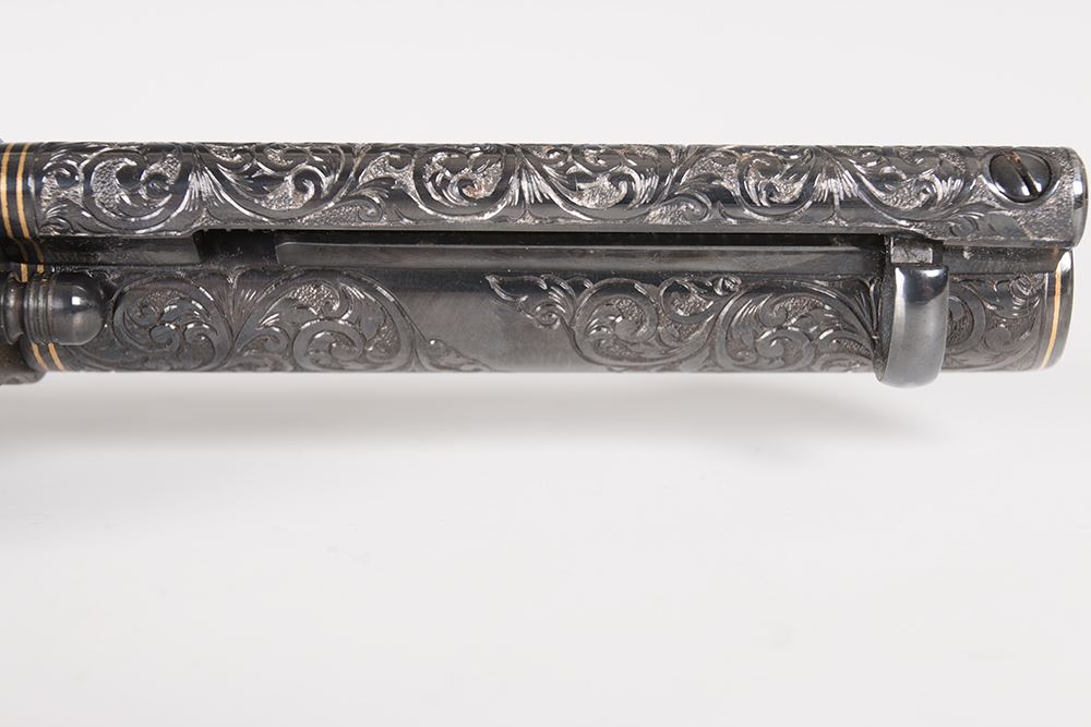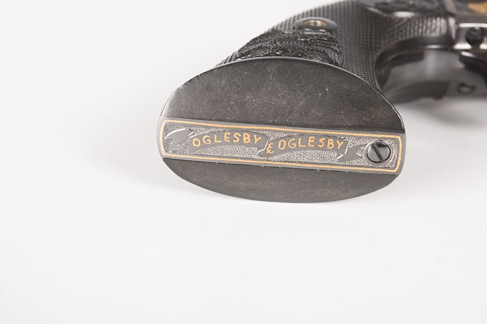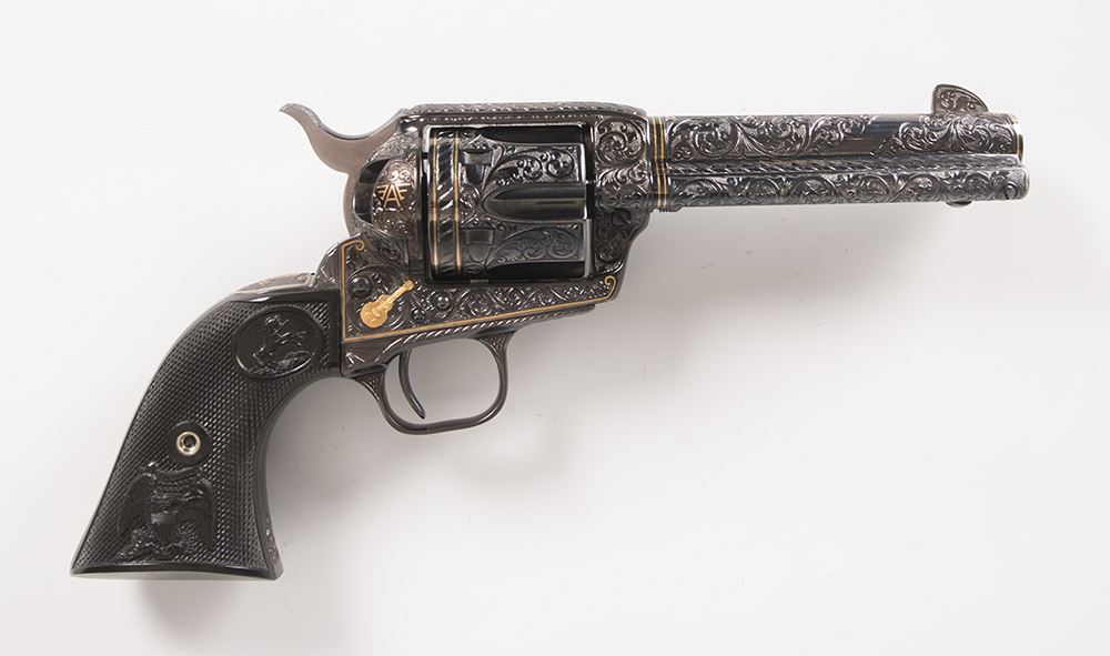 Colt Single Action Army Revolver. 4 ¾" barrel, hard rubber grips. .45 caliber. This revolver was customized completely by Oglesby and Oglesby gunshop in Springfield, IL. As a tribute to movie star Gene Autry, almost 100% of the surface of the revolver is beautifully engraved. Numerous areas of the revolver show gold outlines. Gold inlays of a saddle, boot, guitar, and brands are seen at several locations. "Gene Autry" inlaid in gold on backstrap. FFL dealer transfer required. As new and spectacular.