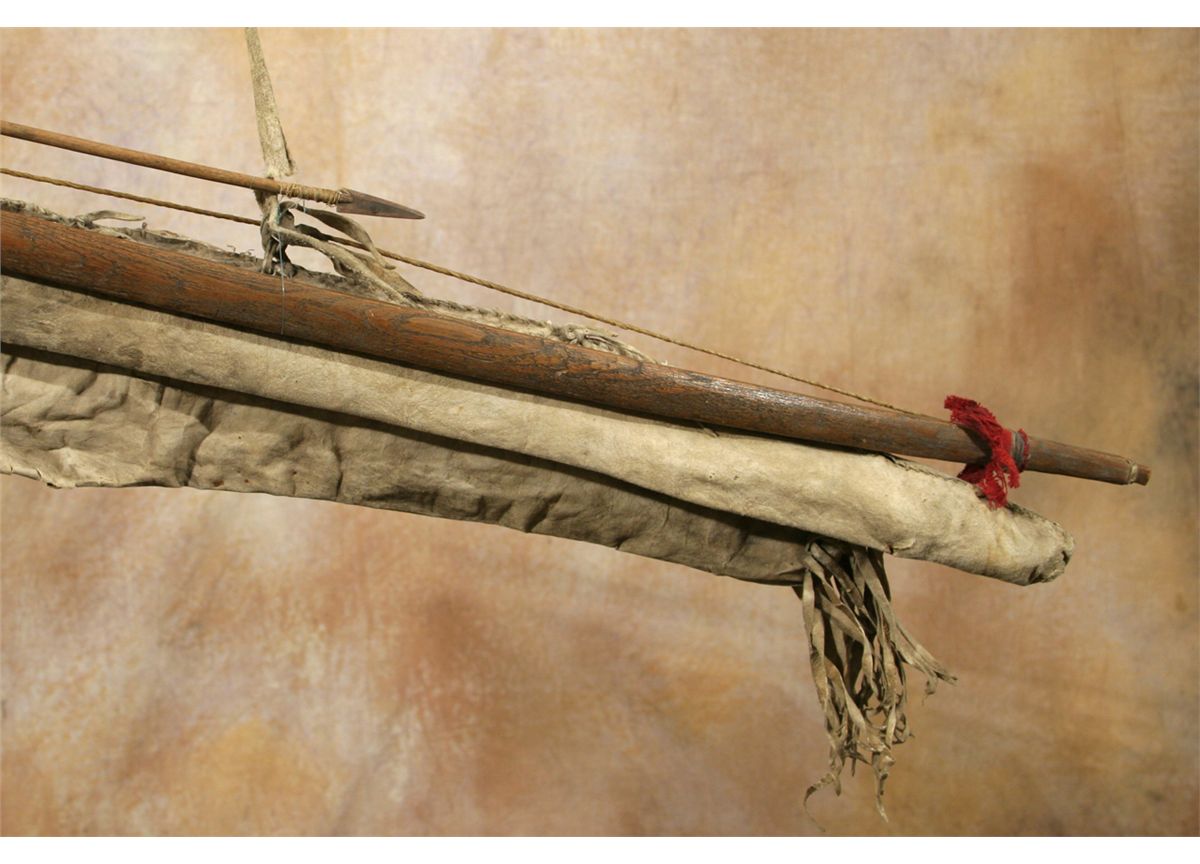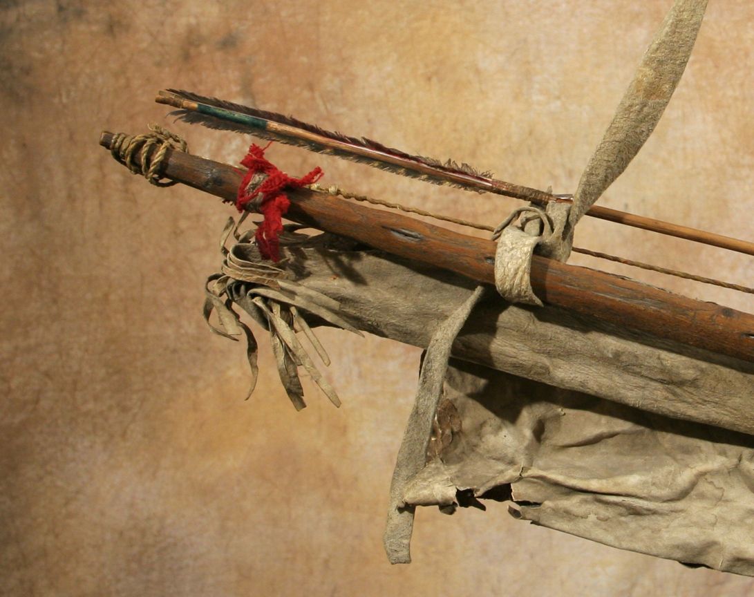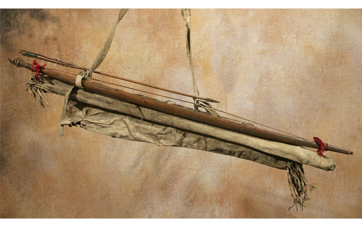 Comanche Bow & Quiver Set. 29" quiver & 40" bow case constructed from buffalo hide with fringe. Included is a 43" bow embellished with red trade cloth, and two 26" steel tipped arrows with turkey feather fletching & green pigment. Circa 1860s. Condition reports can be viewed at www.marchinmontana.com/docs/2013CR.pdf