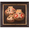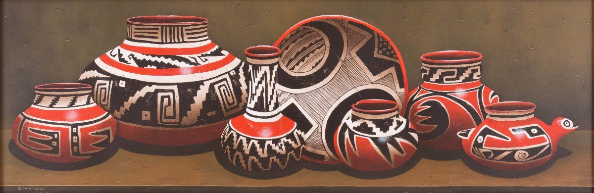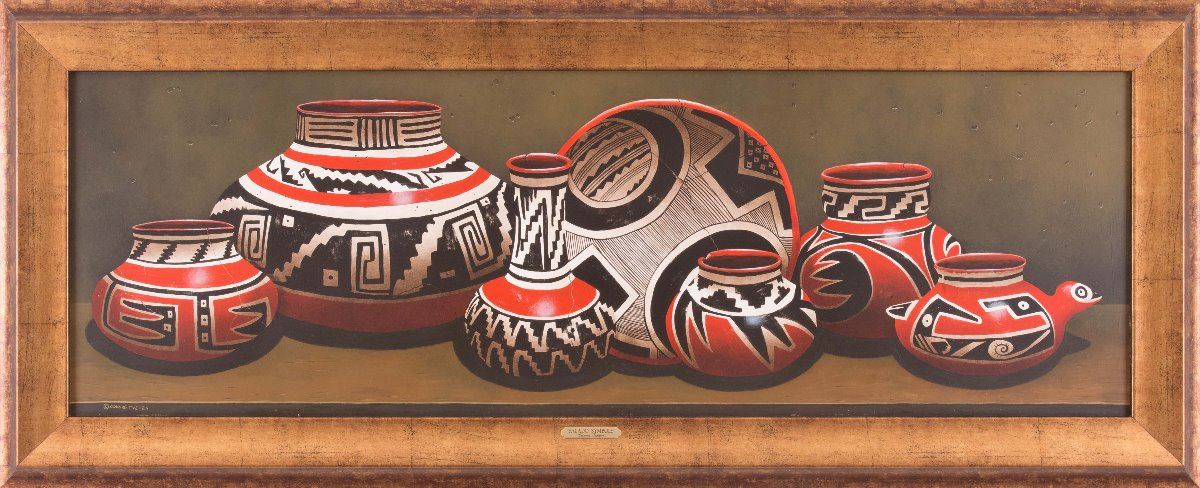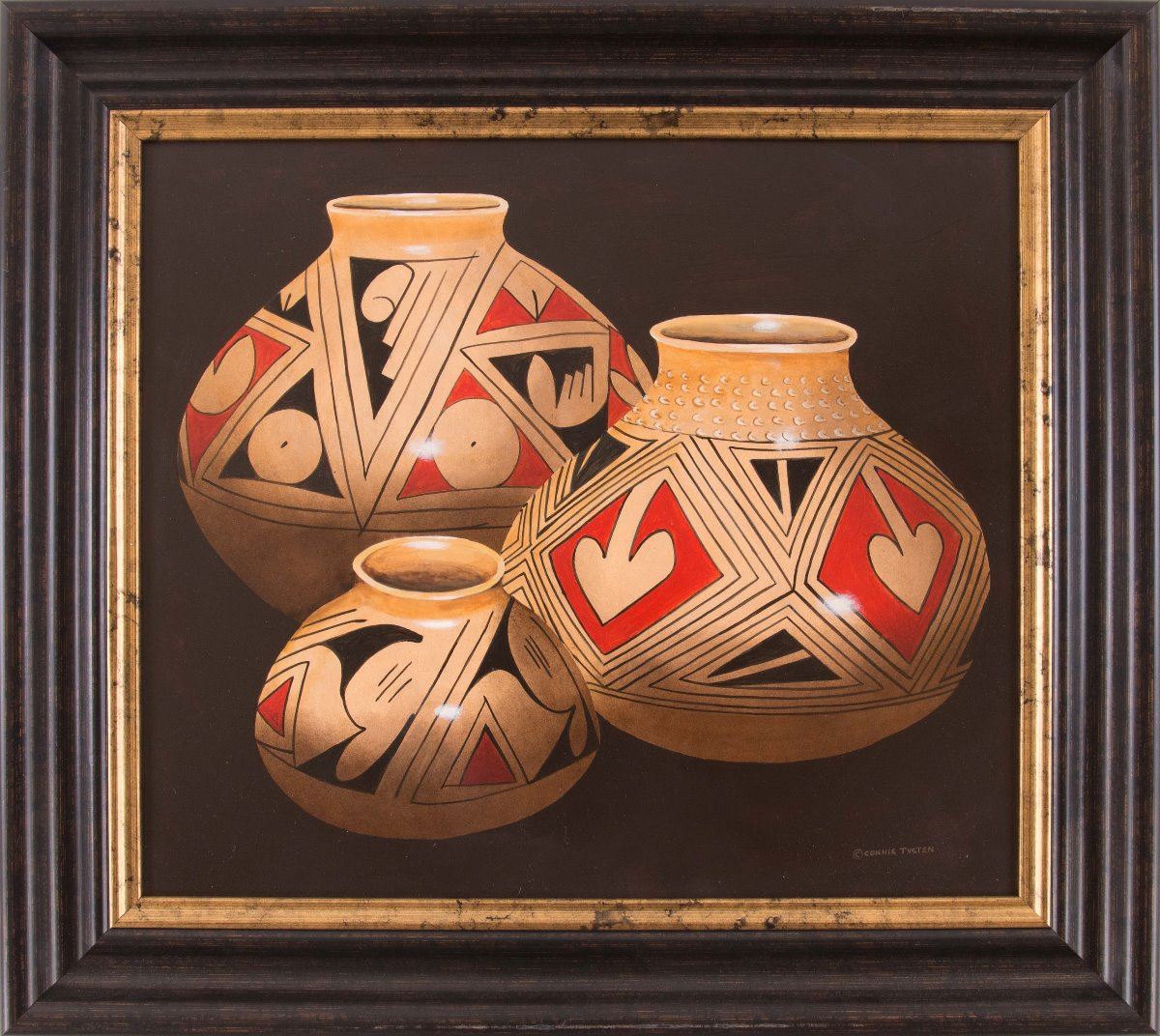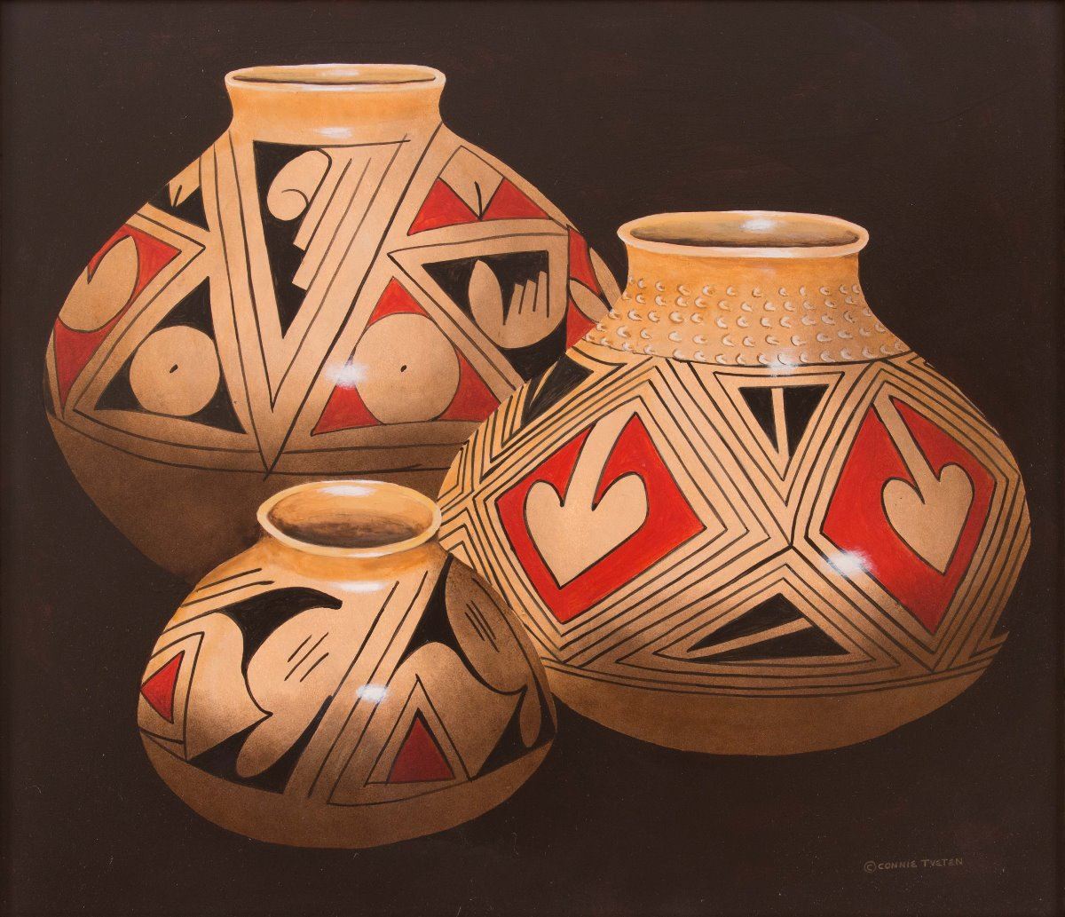 Connie Tveten (20th century). Two works. 1) Three Pots. 12 ½" x 14 ½" acrylic on board. Signed lower right . 2) Salado Symbols. 11 ½" x 36" acrylic on board. Signed lower left.