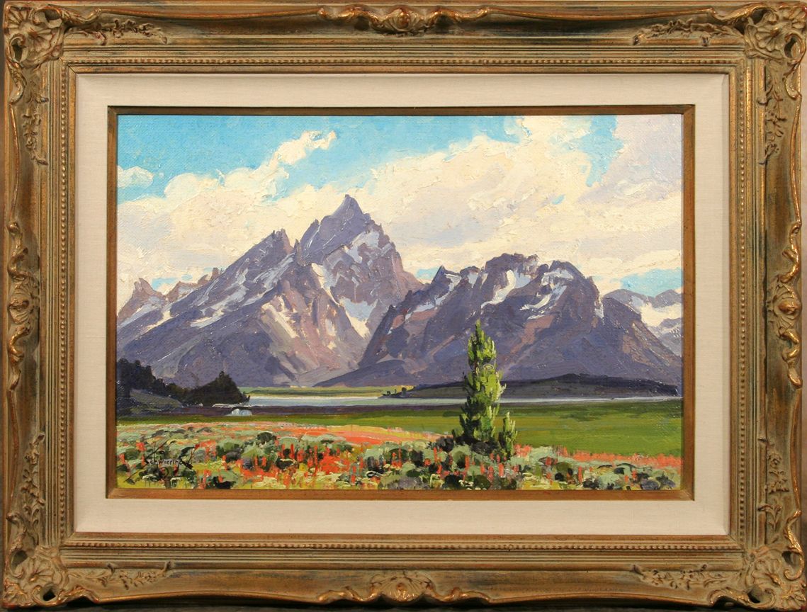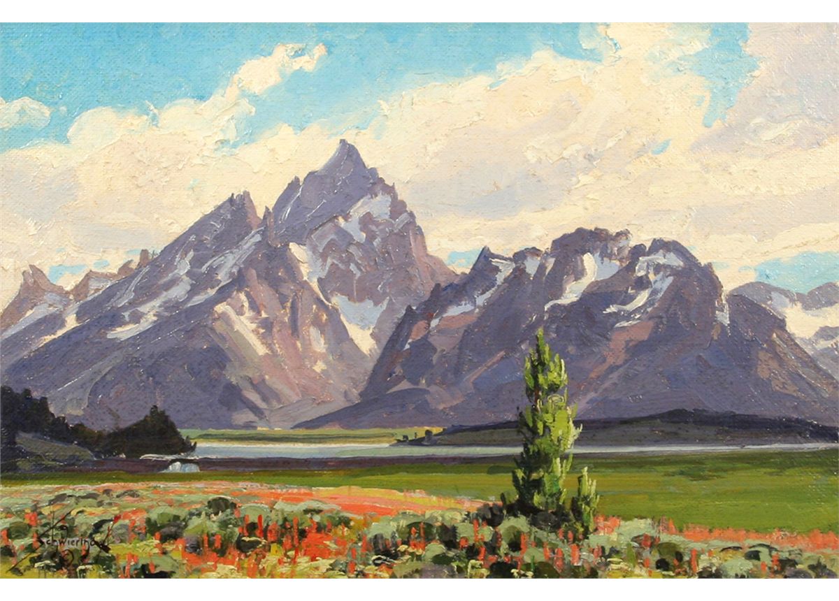 Conrad Schwiering (1916 - 1986). Teton Tapestry. 16" x 24" oil on board. Signed lower left: Schwiering [Indian Paintbrush] ©