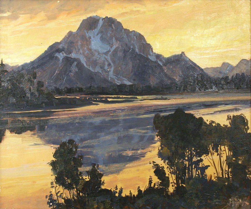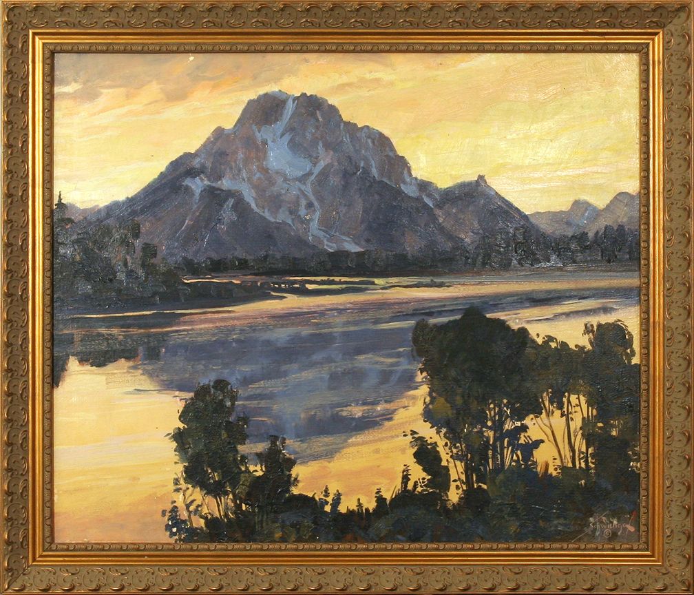 Conrad Schwiering (1916 - 1986). Moran Reflections. 20" x 24" oil on board. Signed lower right: Schwiering [Indian Paintbrush] ©. Schwiering inventory sticker verso: No. 213 Moran Reflections. Condition reports can be viewed at www.marchinmontana.com/docs/2013CR.pdf
