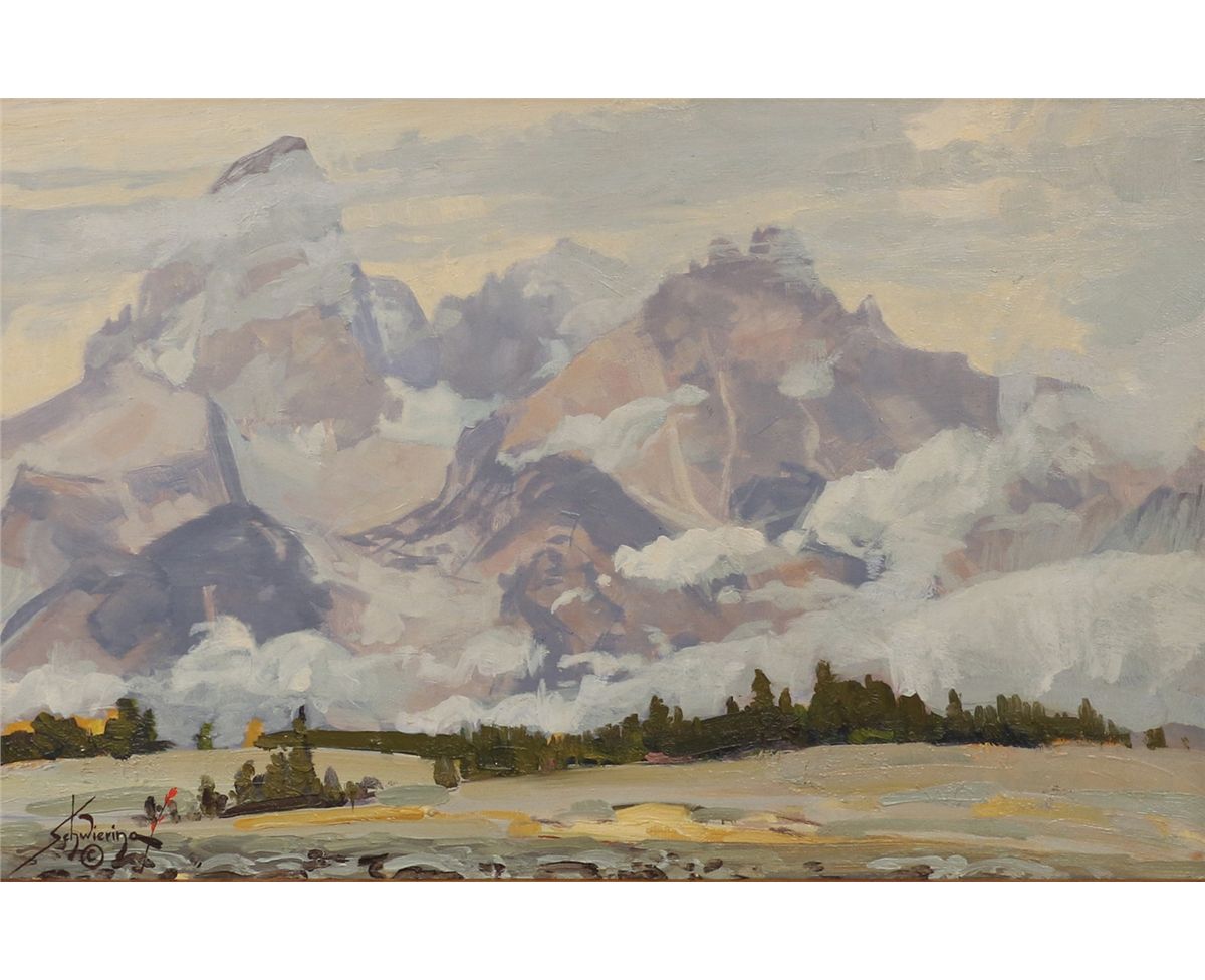 Conrad Schwiering (1916 - 1986). Fall Weather. 12" x 18" oil on board. Signed lower left: Schwiering © [Indian paintbrush]. Artist's inventory sticker is attached: No. 288 Fall Weather.