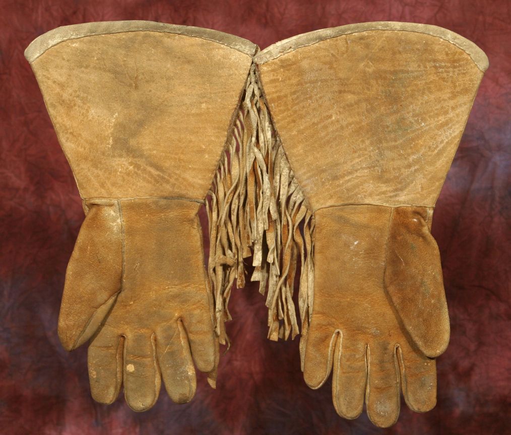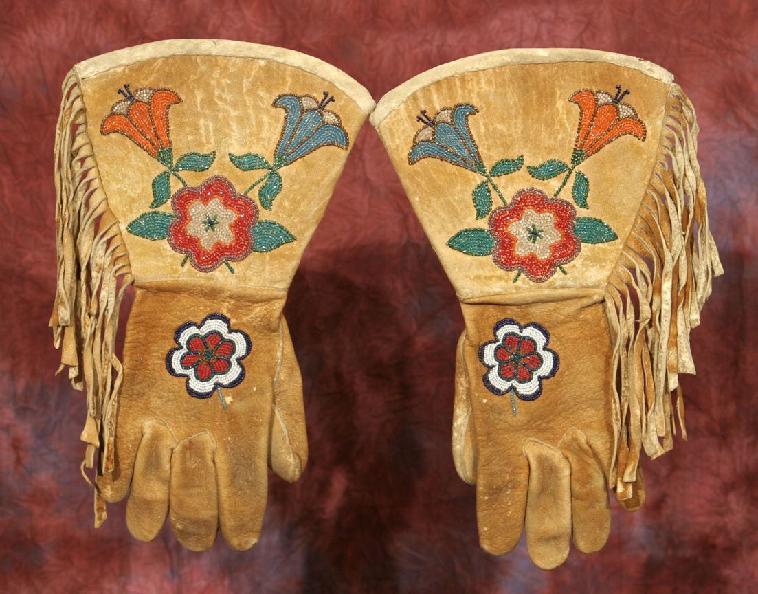 Crow Gauntlets. 14" x 8" with 5" fringe. Partially beaded floral design. Appear to be beaded commercial gloves lined with trade cloth. Circa 1920s. Provenance: Collection of Dr. Delwin & Karen Bokelman, PA., & pictured in their book Precious Dreams, page 45. Condition reports can be viewed at www.marchinmontana.com/docs/2013CR.pdf