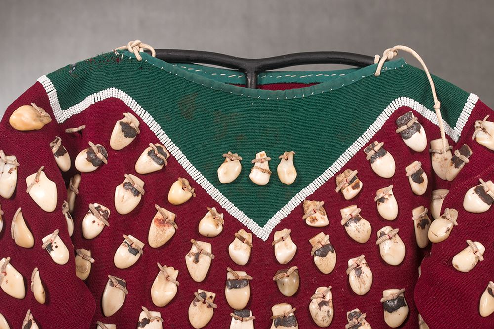 Crow Beaded Girl's Dress. 27" long x 32" wide at yolk. Decorated with 155 elk teeth on front, 170 on back. Red trade wool trimmed with cotton trade cloth at hem and around neck. Late 19th century.