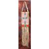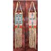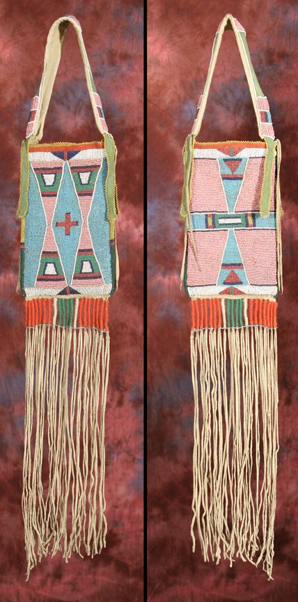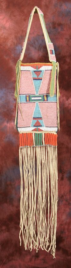 Crow Mirror Bag. 9" x 5.5". Fully beaded in a classic Crow designs. Beaded cloth strap measures 14"x 1 ½". Body is beaded on hide. 1 ½" slats are wrapped in yarn with a small bead line, then terminating in 13" fringe. Fabulous! 19th century. Provenance: Collection of Dr. Delwin & Karen Bokelman, PA., & pictured in their book Precious Dreams, page 17. Condition reports can be viewed at www.marchinmontana.com/docs/2013CR.pdf