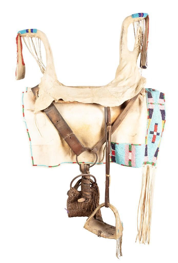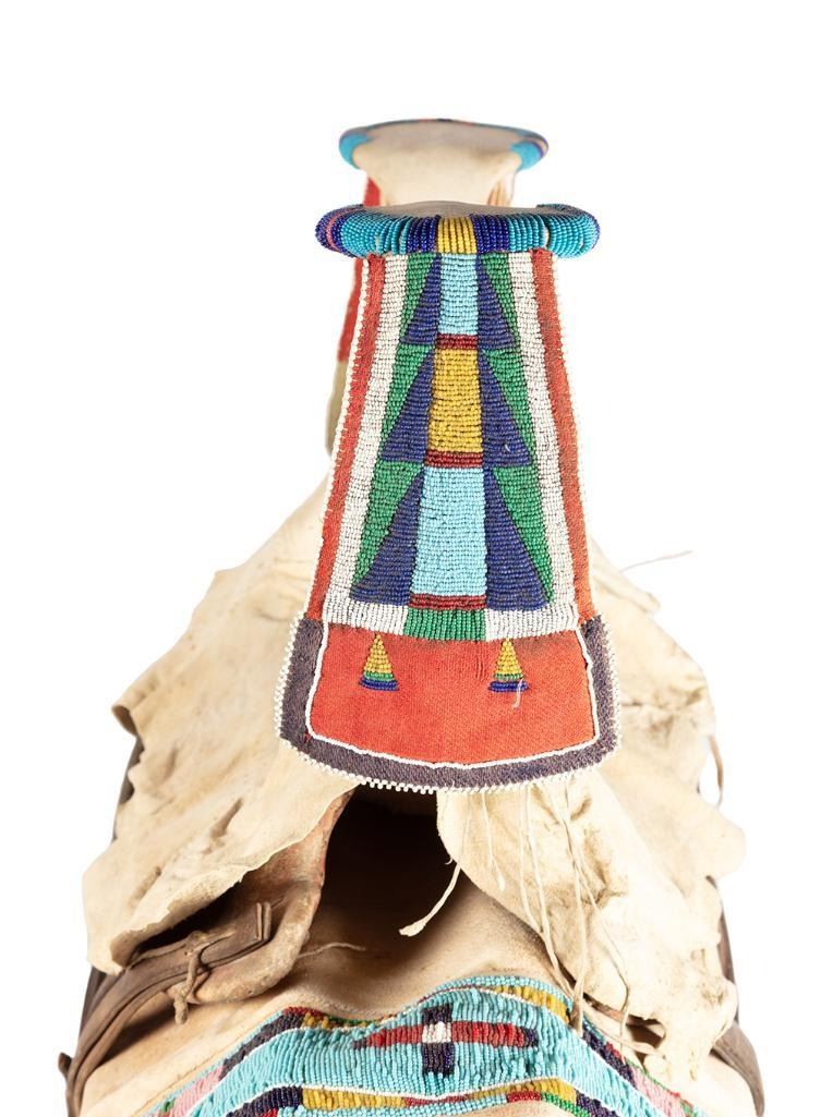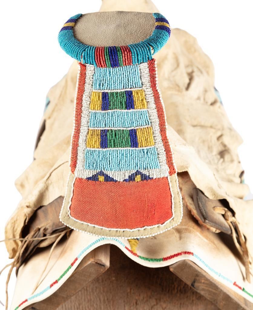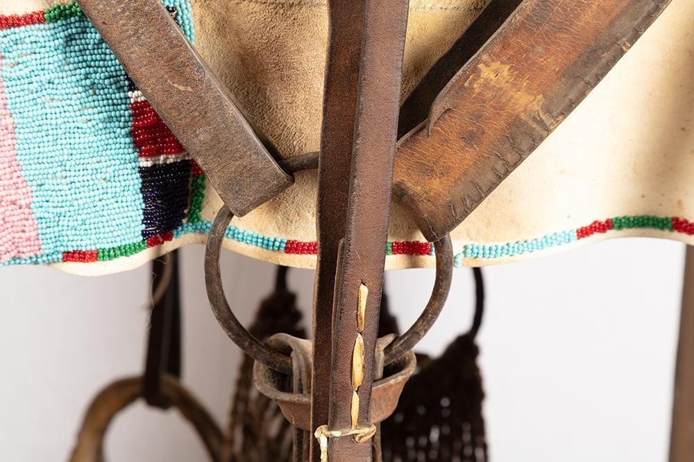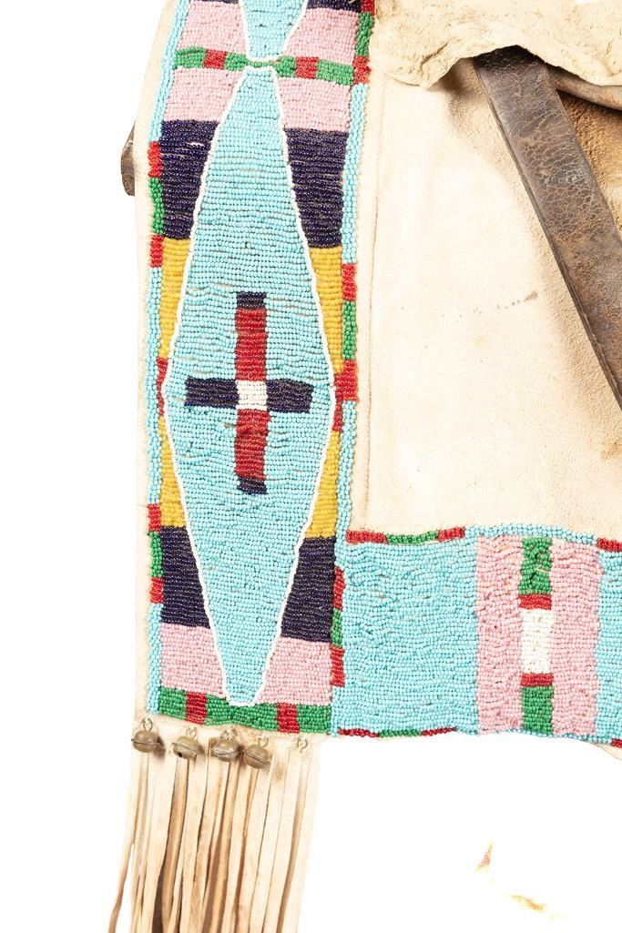 10” seat, decorated with 8” beaded drops, featuring geometric patterns and accented with trade cloth. Original stirrups but saddle drape is not original to saddle. Saddle is late 19th century.