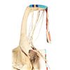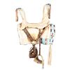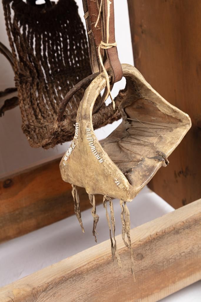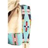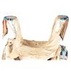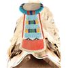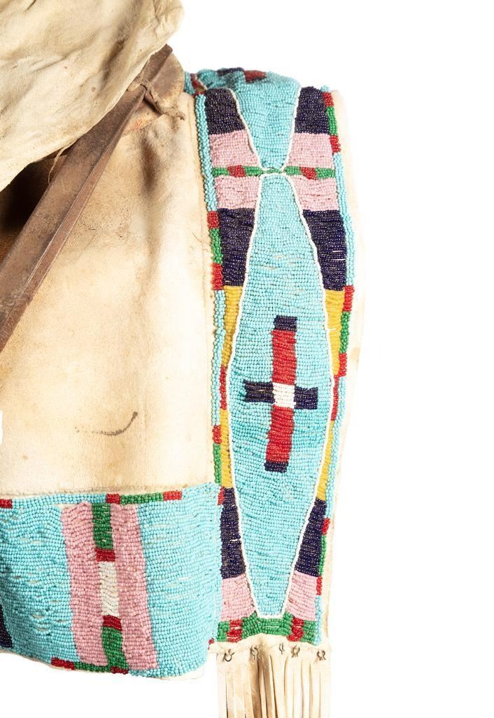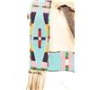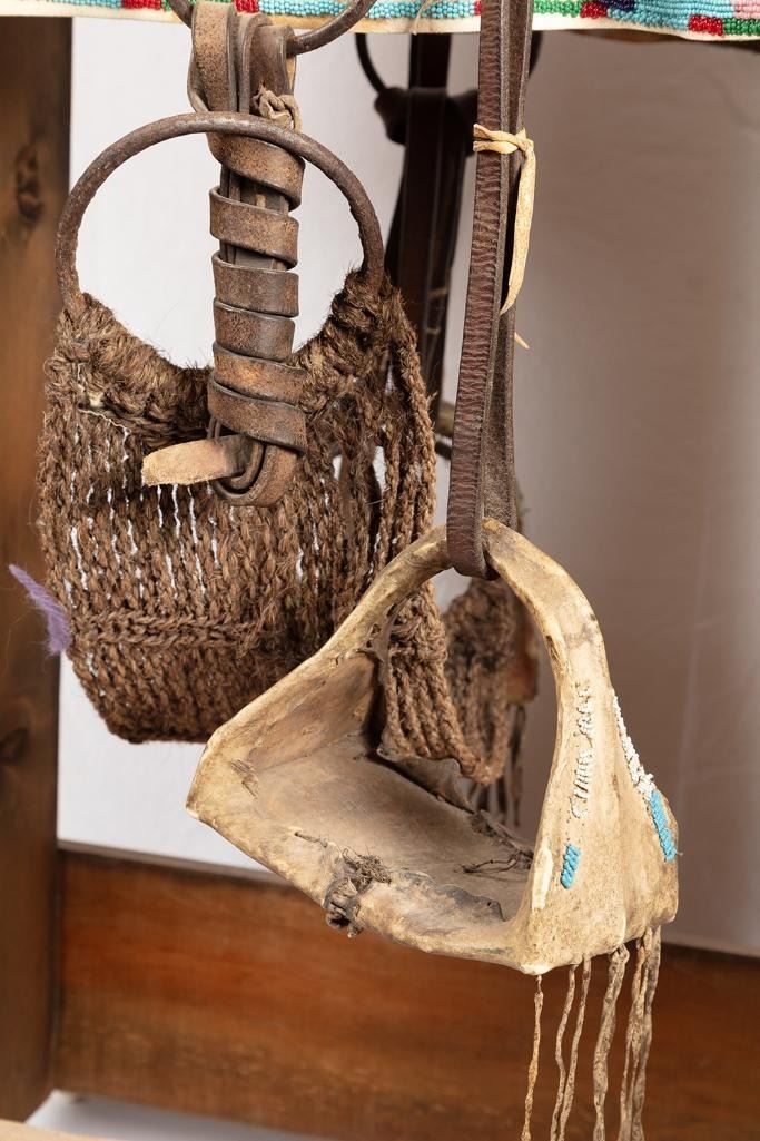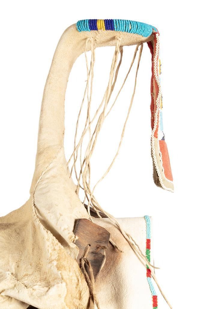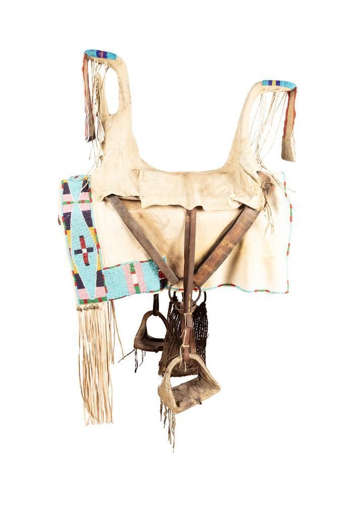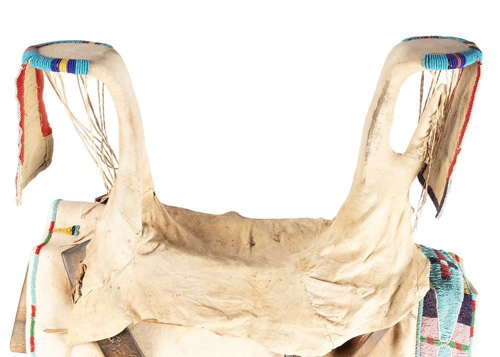 10” seat, decorated with 8” beaded drops, featuring geometric patterns and accented with trade cloth. Original stirrups but saddle drape is not original to saddle. Saddle is late 19th century.