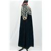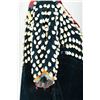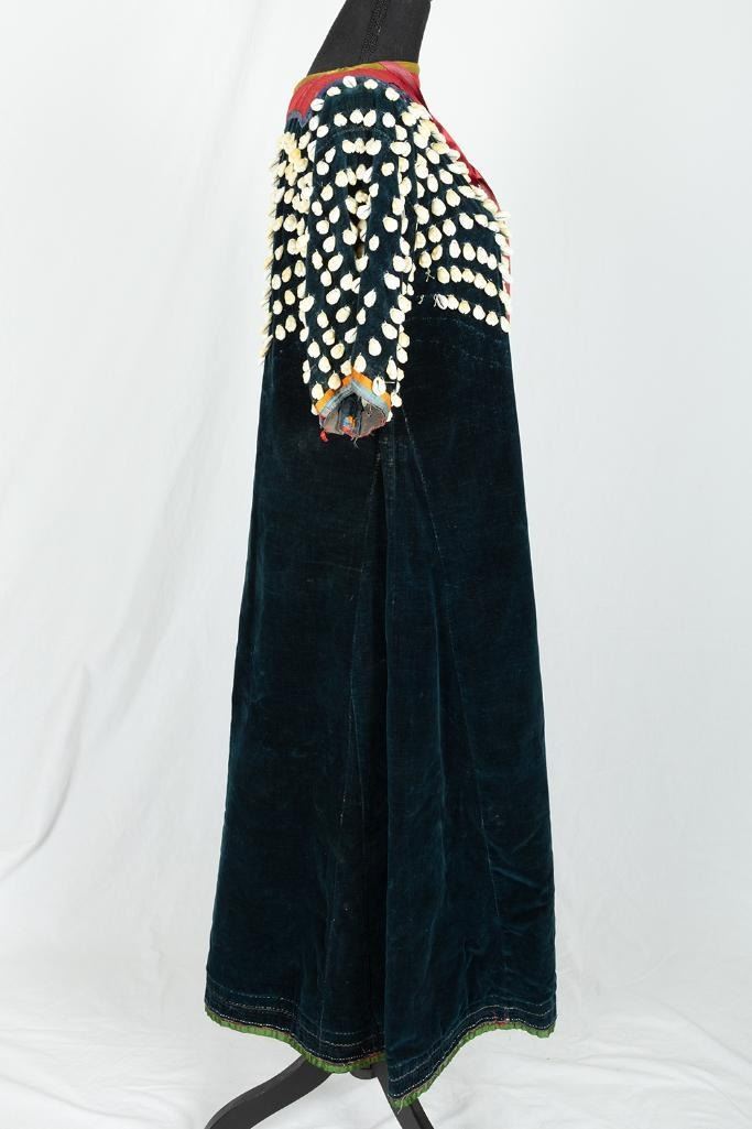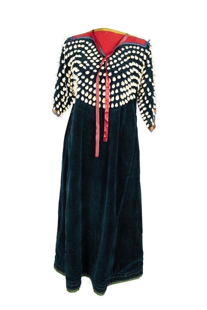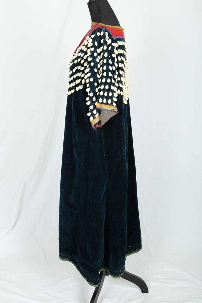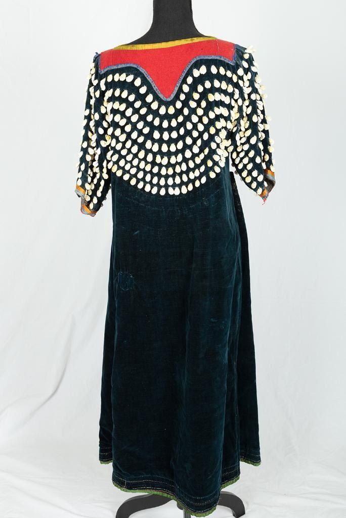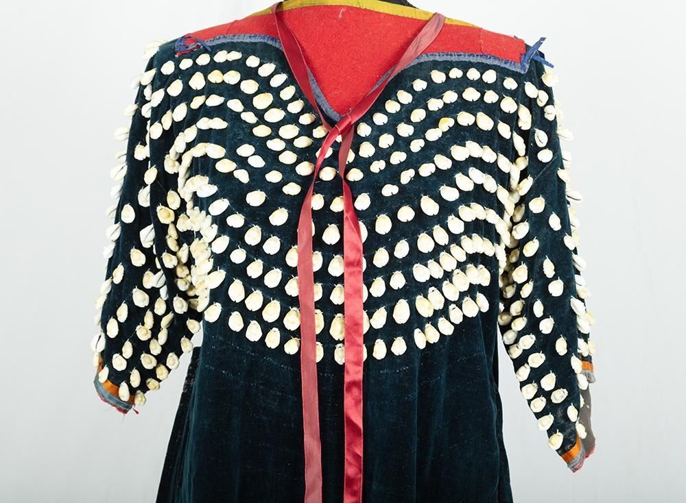 46" long x 14" shoulder to shoulder. Decorated with cowry shells, trade ribbon and red trade cloth on velvet. 19th century.
