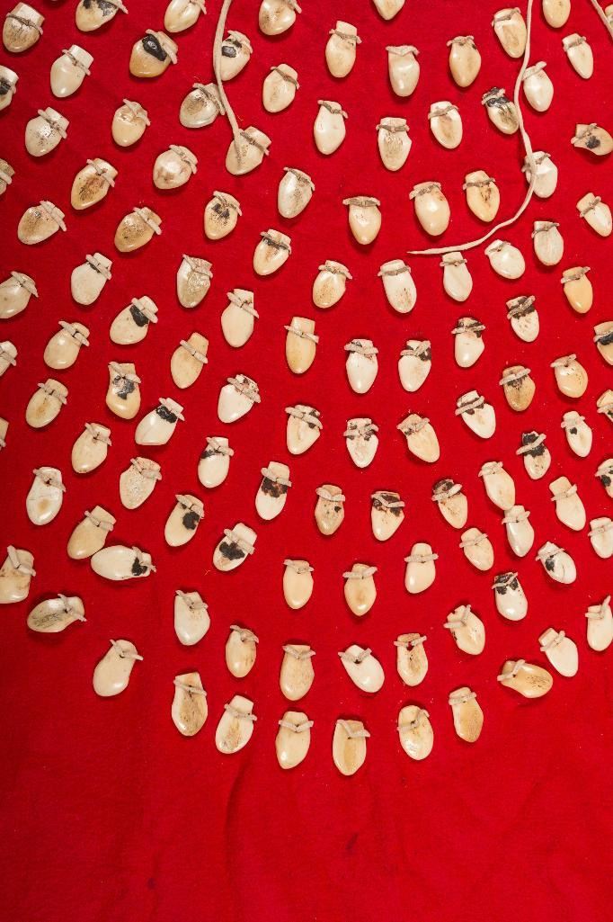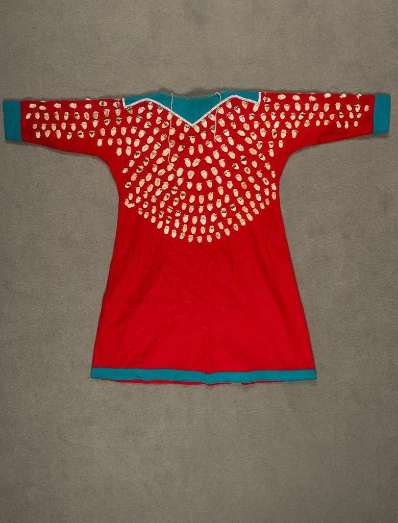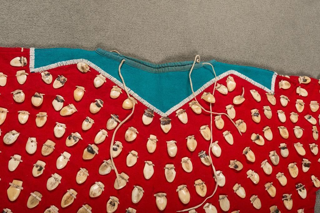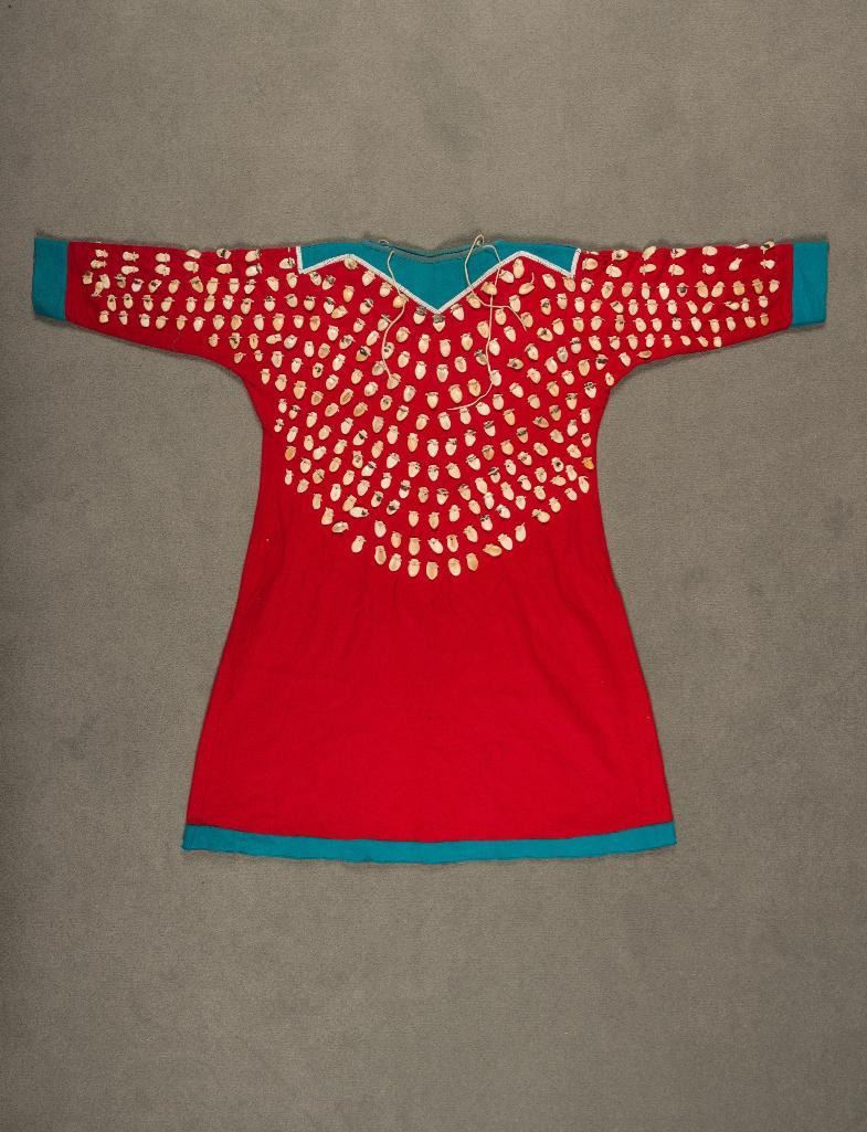 Crow Woman's Dress 43" long x 56" from cuff to cuff. Decorated with over 200 carved elk teeth on each side, on red trade cloth with a turquoise-colored border. Circa 1900. $5,000-6,000