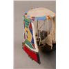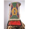 Crow Woman's Saddle. 27" x 12" x 17". Hide over a parfleche frame with a canvas seat, underlining and a two-piece wool pad/liner underneath. Fabulous 10 ½" beaded drop, decorated with trade felt and bells. Original straps and cinch, but no stirrups. 19th century.