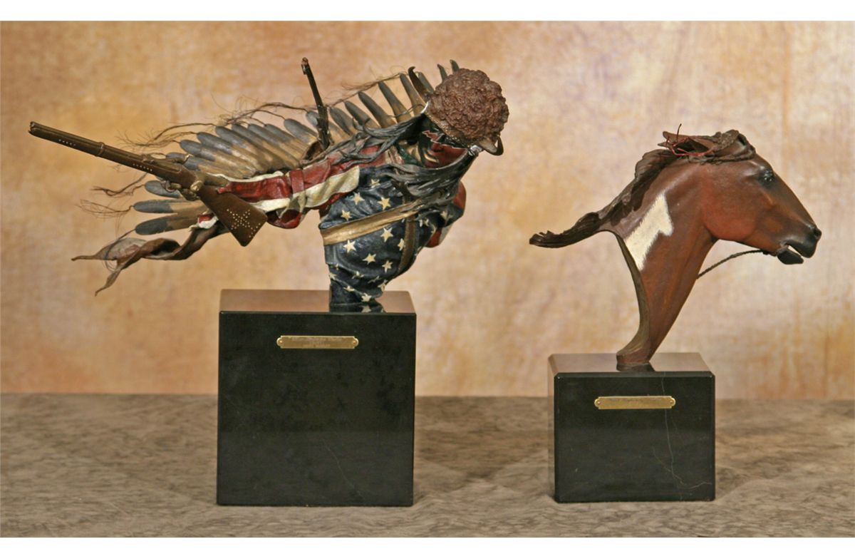 Dave McGary (1958 - ). When Lightning Strikes. Pair of bronzes. 7.5" x 17 x 7.5" warrior, with 6" pedestal base. 7.25" x 9 ¼" x 3" horse, with 4" pedestal base. Both pieces inscribed: Dave McGary 1991 6/75. Condition reports can be viewed at www.marchinmontana.com/docs/2013CR.pdf