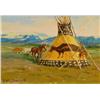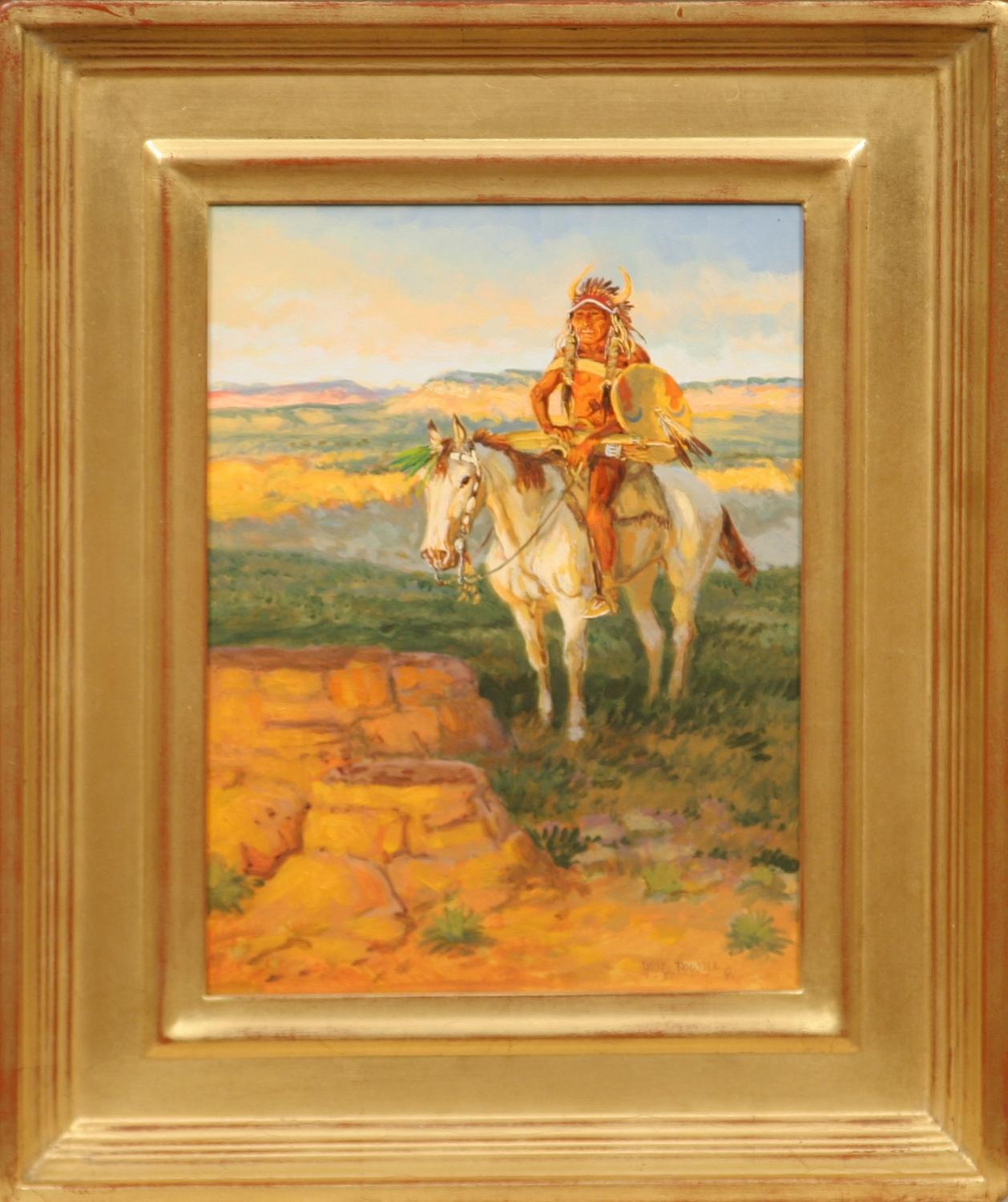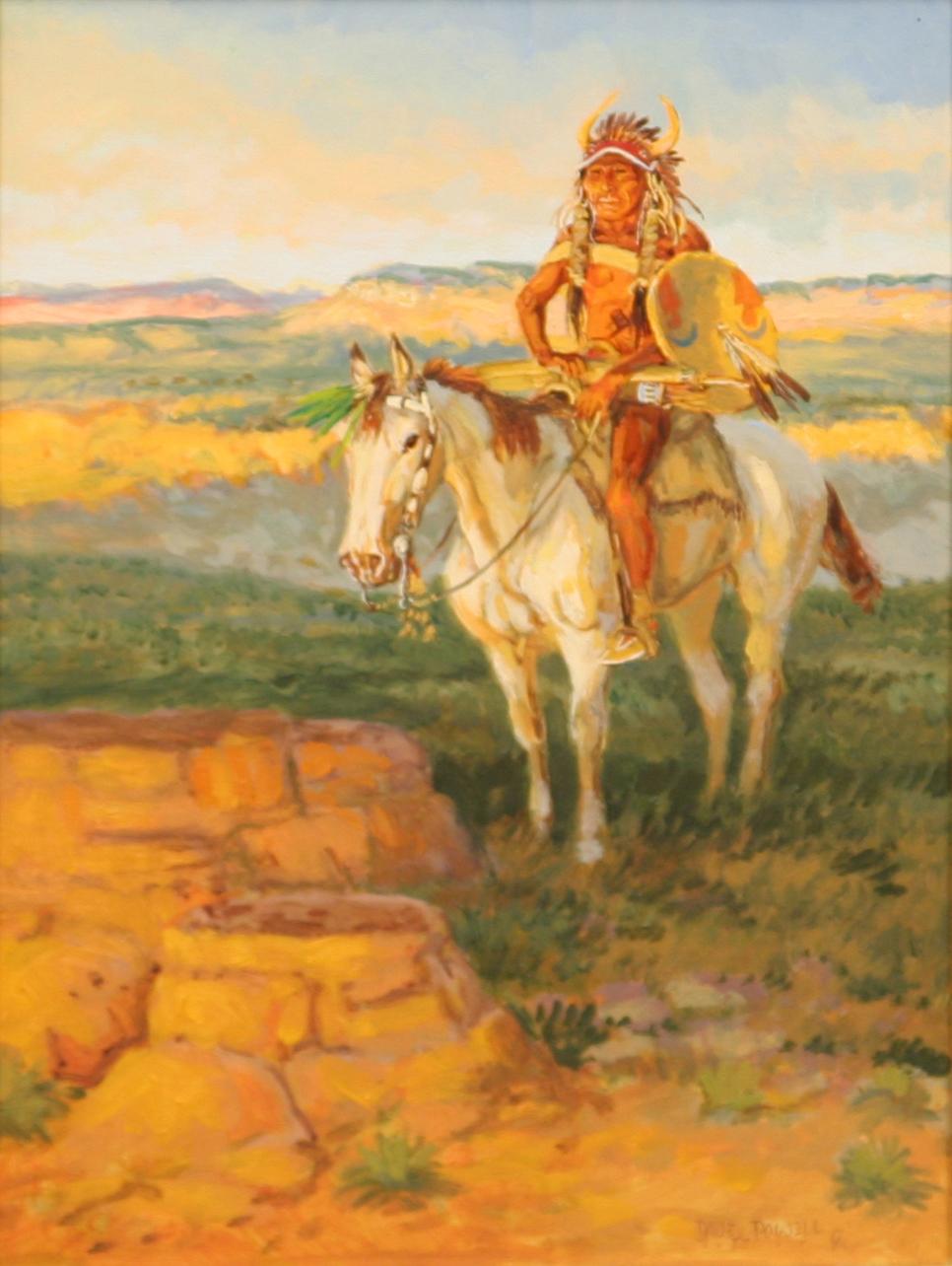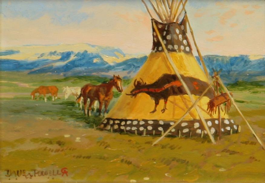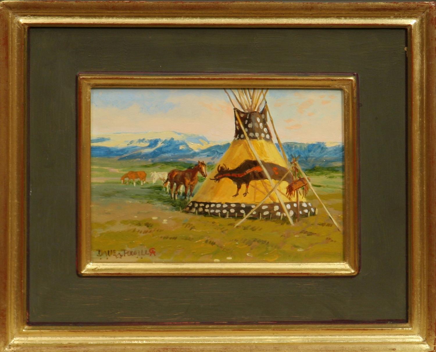Dave Powell (b. 1954), CAA. Pair of oils on board. (1) Yellow Buffalo Lodge. 4 ¾" x 6 ¾". signed lower left. (2) Timber Mountains Shield, Kiowa. 9" x 12". signed lower right. (est $1,000-1,500). . Provenance: Estate of Paul & Doris Masa, Kalispell, MT. Condition Report: Both black light clean