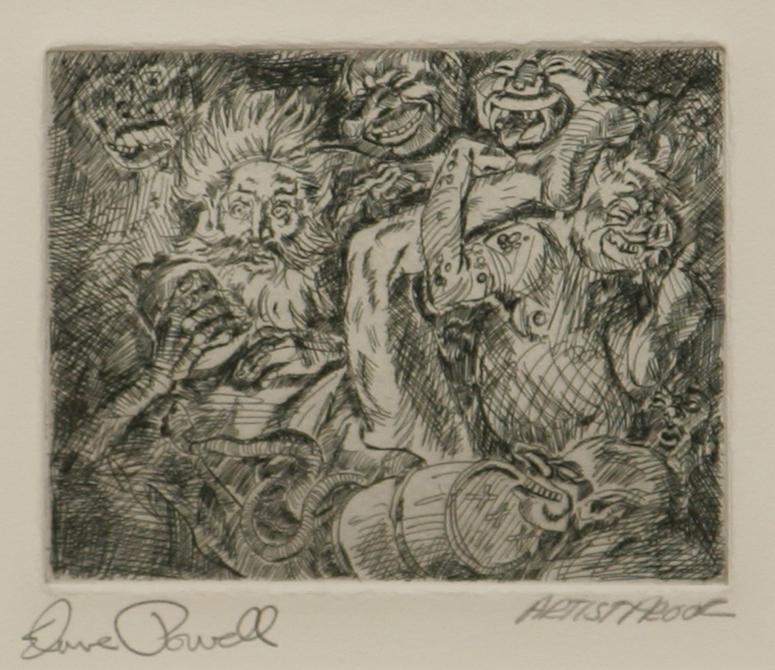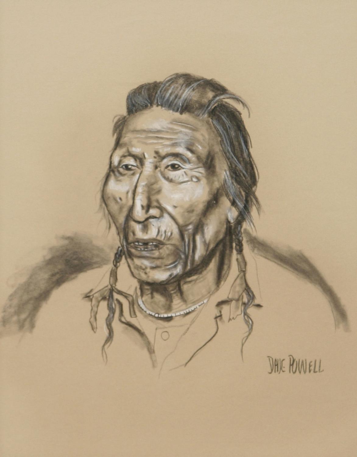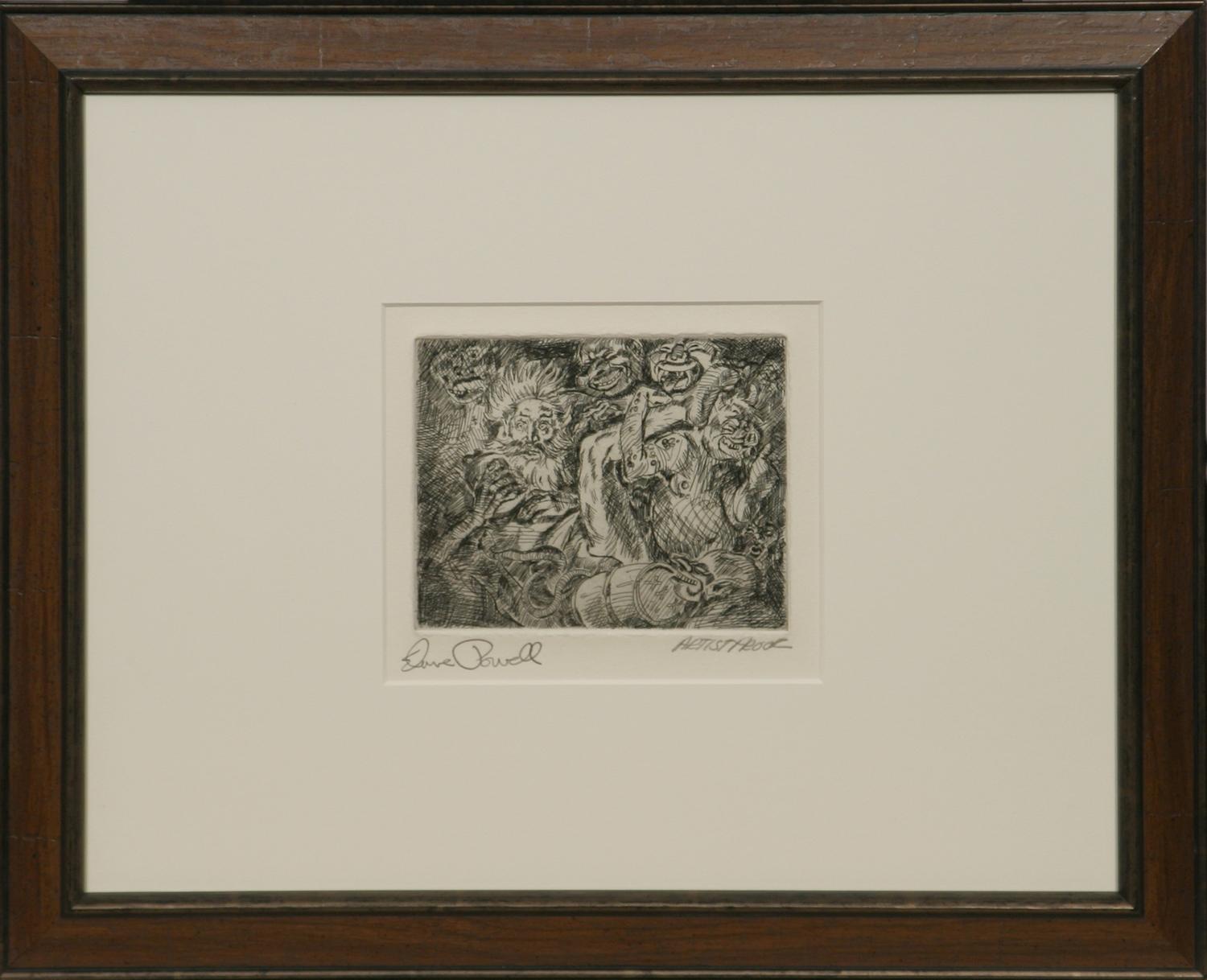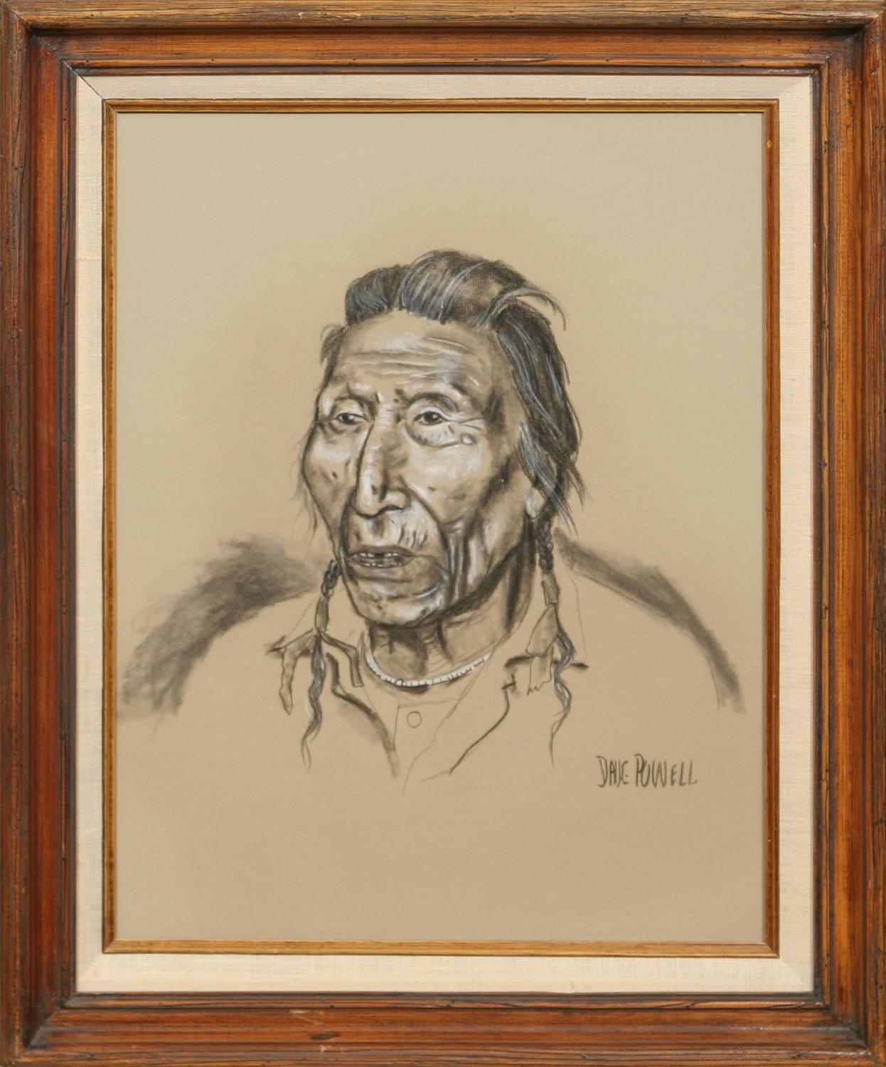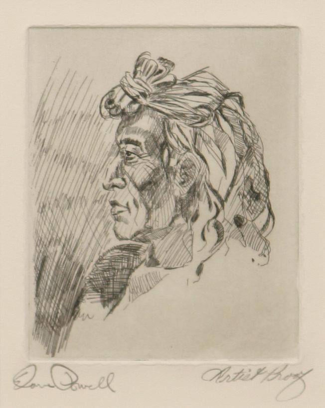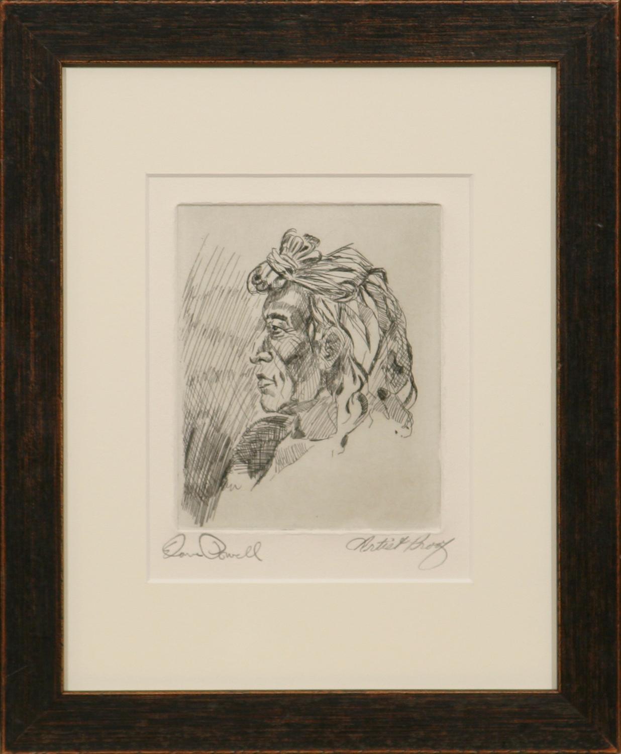 Dave Powell (b. 1954), CAA. Collection of three works. (1) Bull Head. 17 ¾" x 13 ¾" charcoal. signed lower right. (2) Bad Missouri Booze. 4" x 5" etching. pencil signed lower left. (3) Portrait Of A Brave. 5" x 4" etching. pencil signed lower left. (est $600-900) Condition Report: All in fine condition