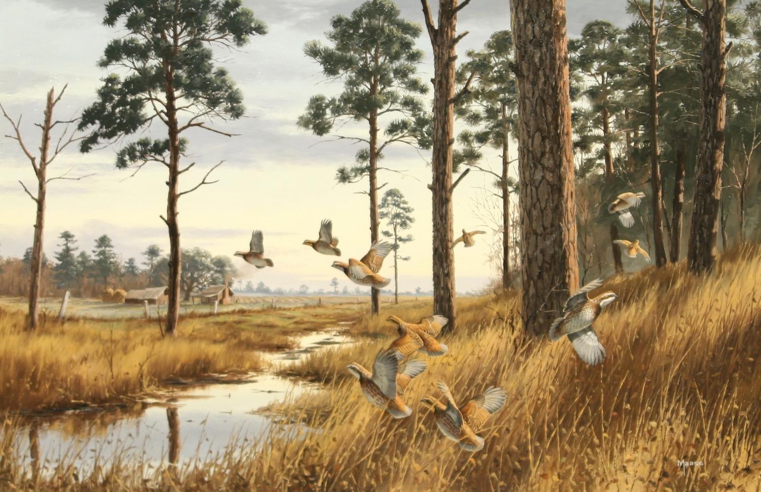 David Maass (b. 1929). Homestead Covey-Bobwhite Quail. 24" x 36" oil on board. signed lower right. (est $6,000-9,000) Condition Report: Black lights clean. In nice distressed wood frame
