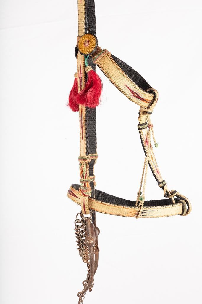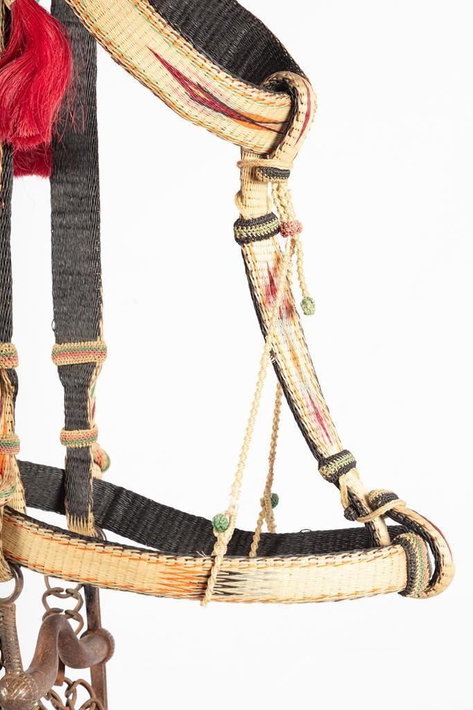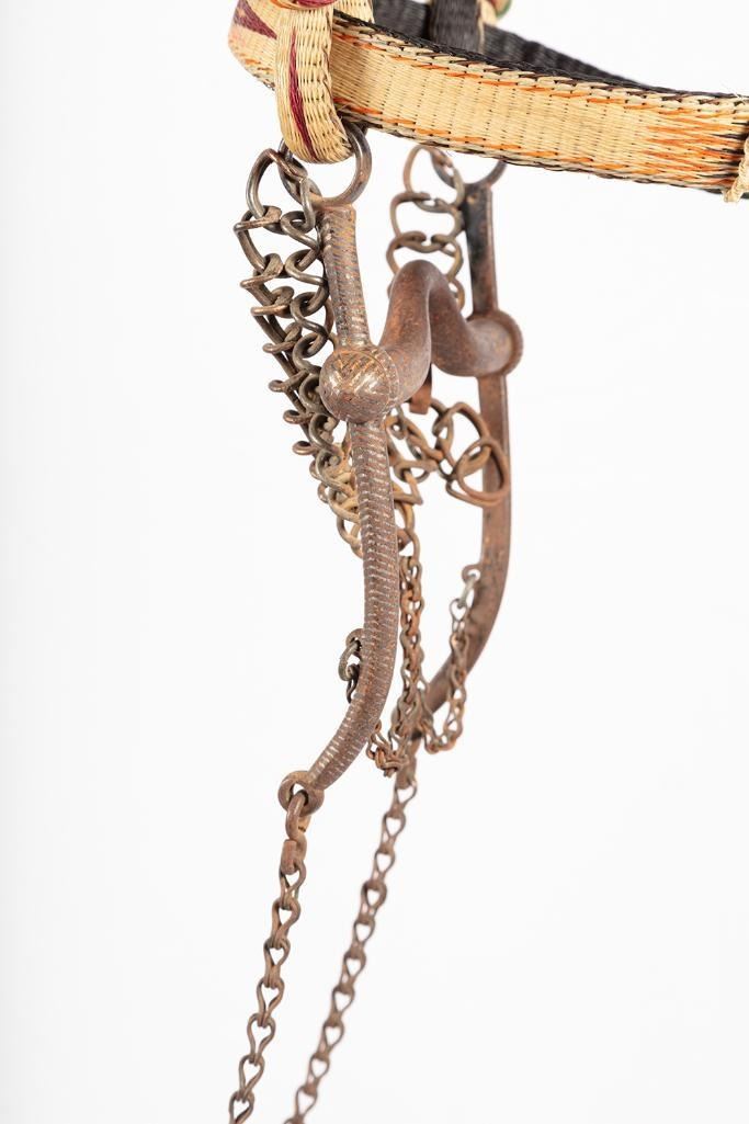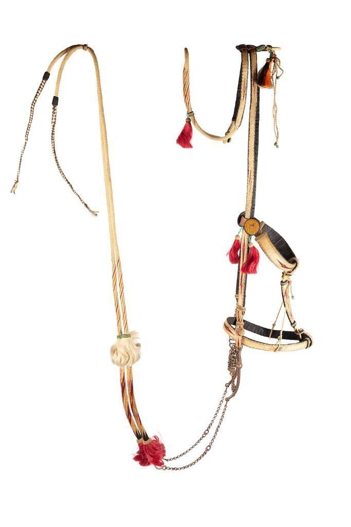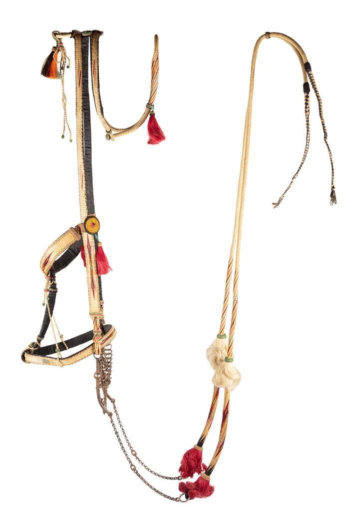 Accented with colored rope, dyed horsehair, unmarked bit, and geometric designs. Early 20th century.