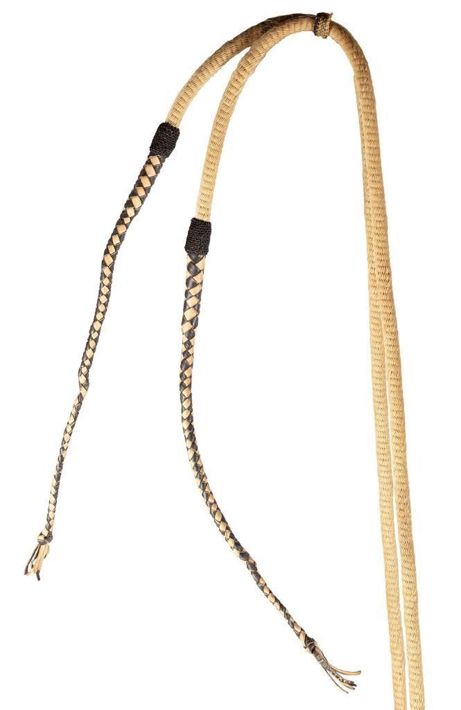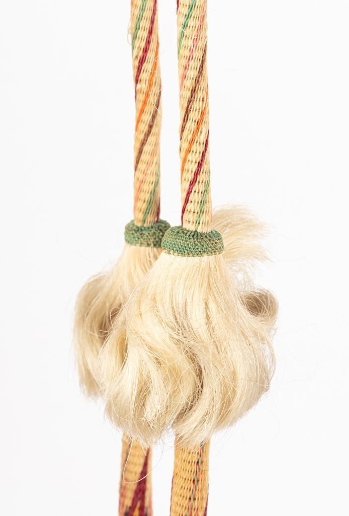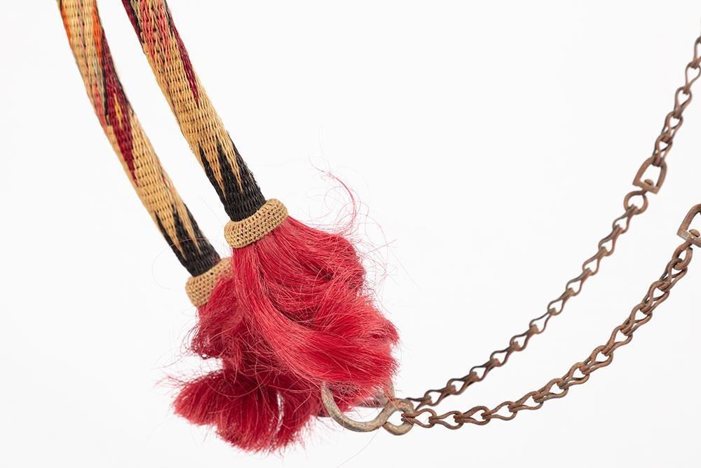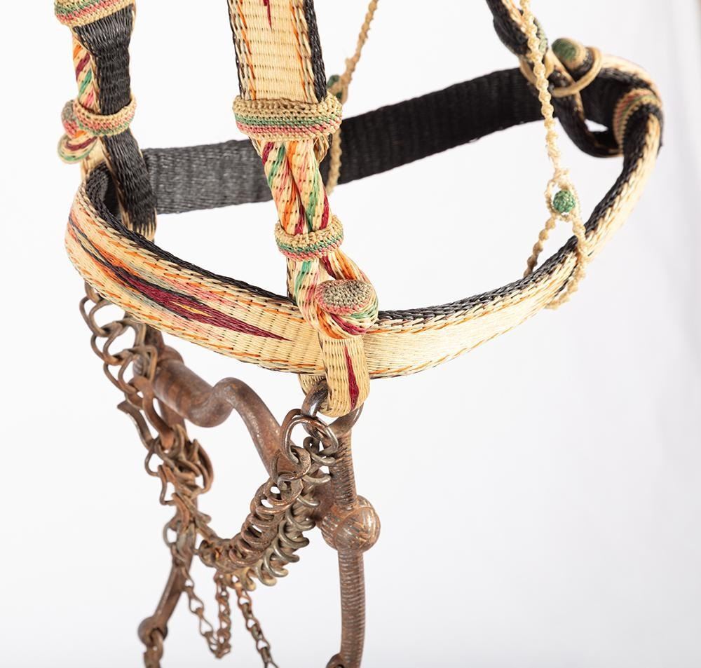 Accented with colored rope, dyed horsehair, unmarked bit, and geometric designs. Early 20th century.