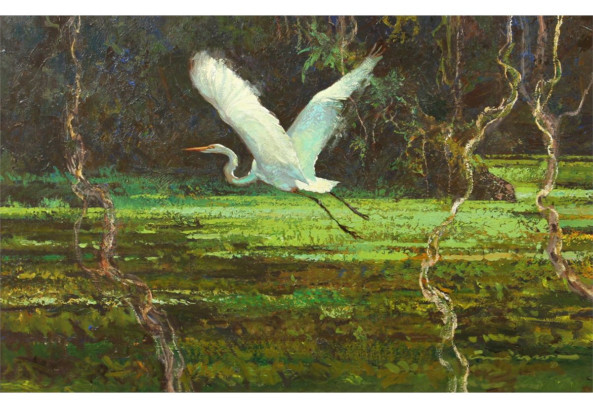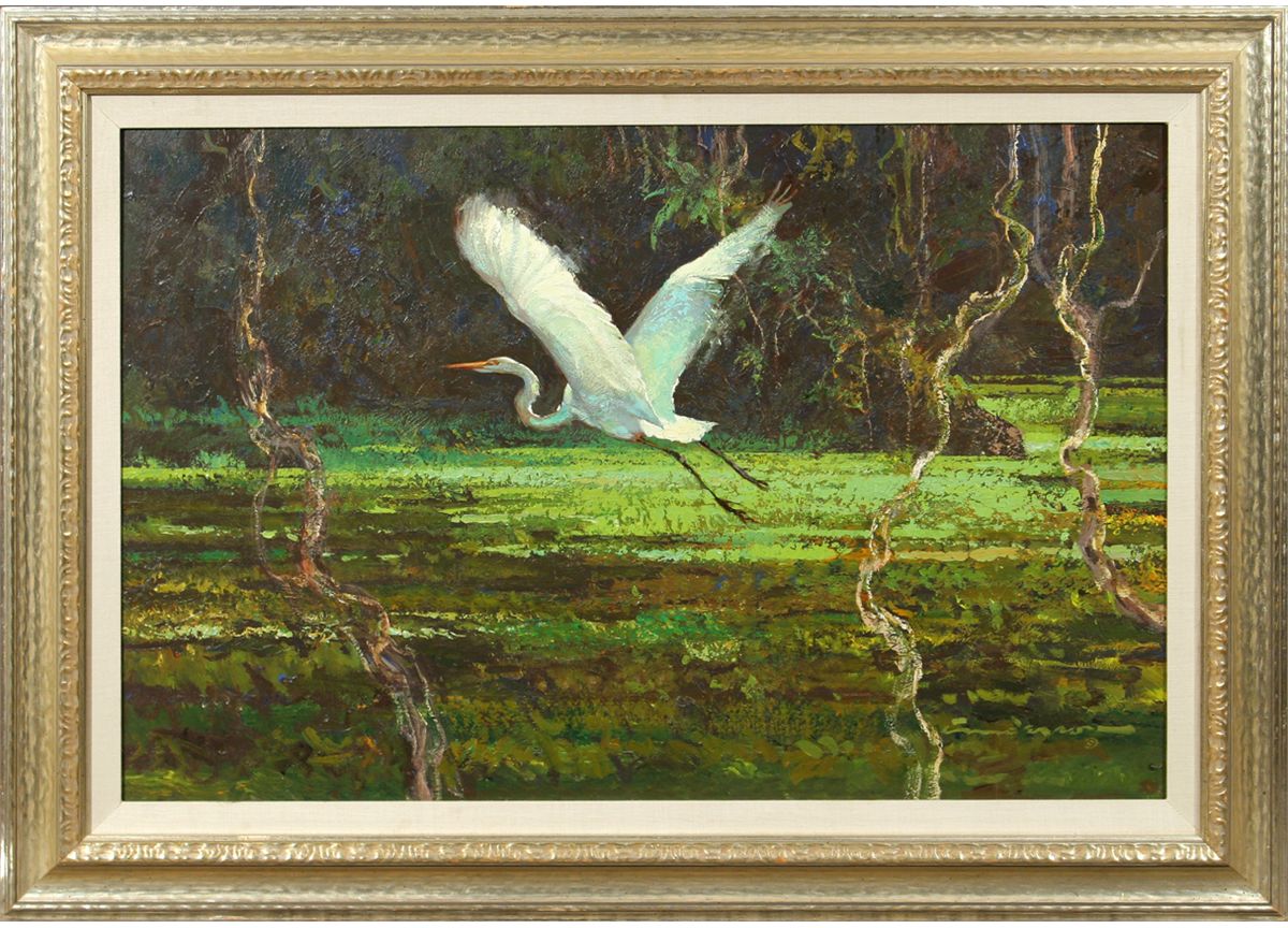 Dennis P. Anderson (1940 - 2005). Crane. 24" x 36" oil on board. Signed lower right: Anderson © . Condition reports can be viewed at www.marchinmontana.com/docs/2013CR.pdf