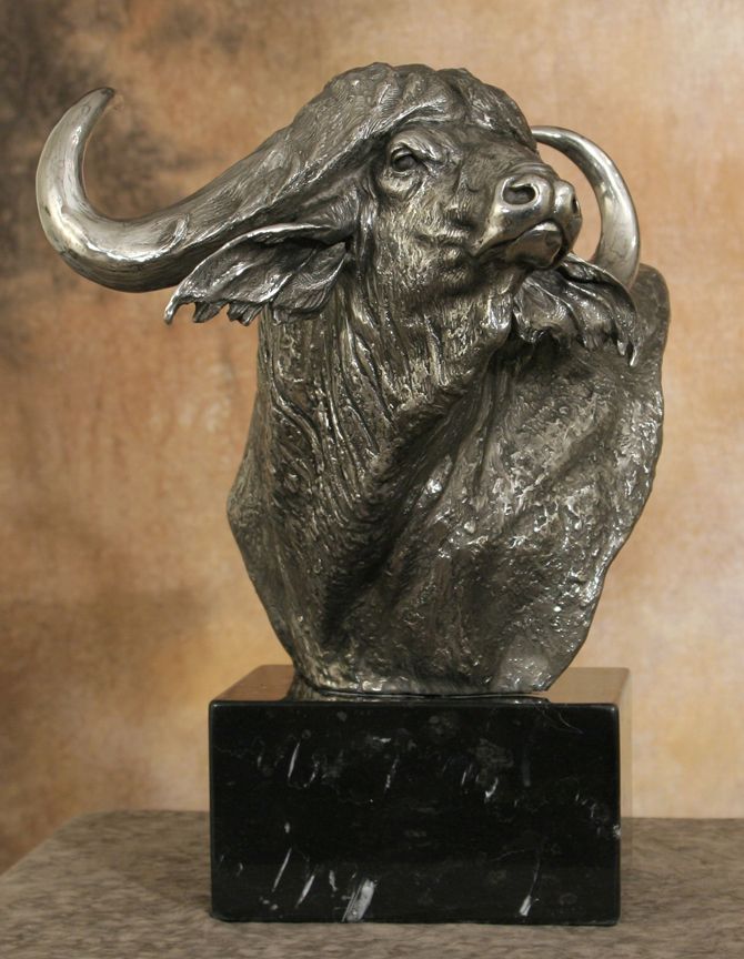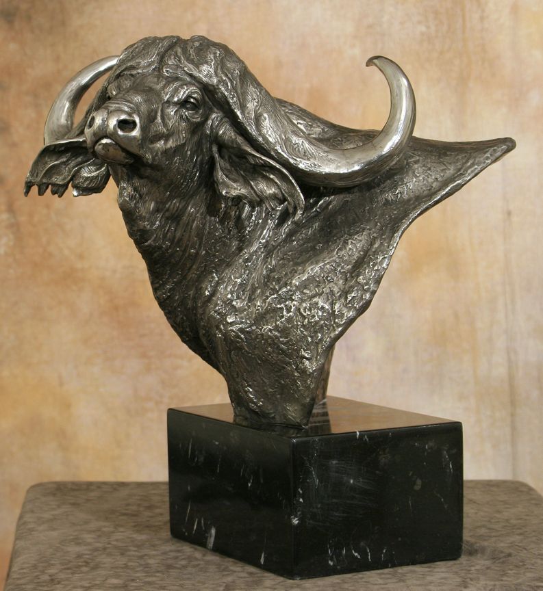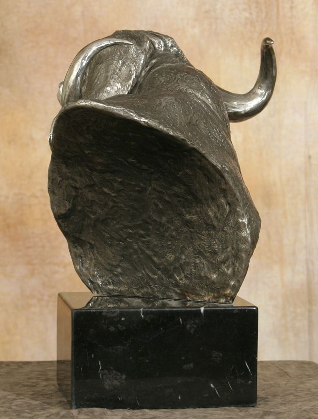 Dennis P. Anderson (1940 - 2005). Dagga Boy. 14" x 18" x 15" stainless. On a 5" marble pedestal base. Inscribed: AP/10 © Anderson. Internet, absentee & telephone/absentee & phone bidders please be advised that this sculpture weighs 67 lbs. Please call our shipper for an estimate prior to bidding - The Box Shop of Cheyenne (307) 634-0221. Condition reports can be viewed at www.marchinmontana.com/docs/2013CR.pdf