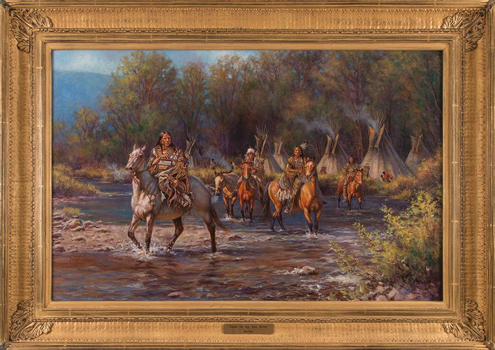 Don Oelze (1965 - ). Camp on the Sun River. 26" x 40" oil on canvas. Signed lower right.