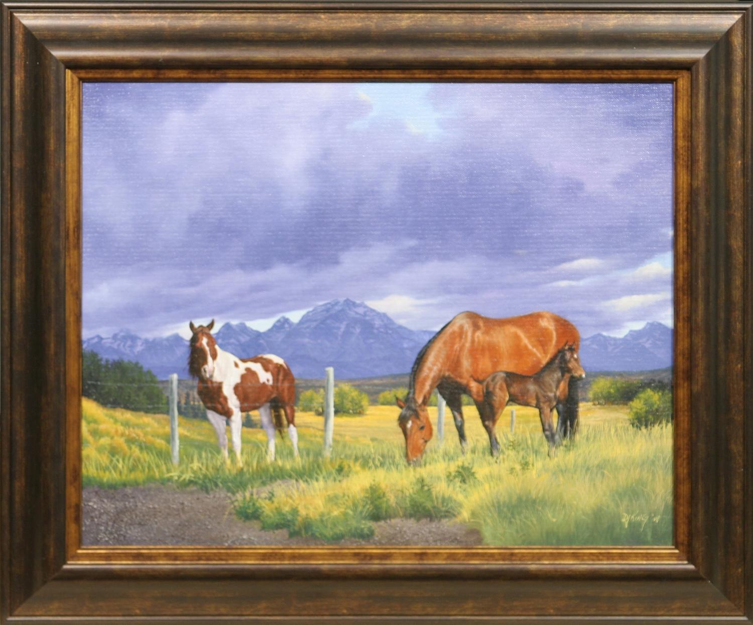 Donna King (b. 1955). New Neighbor. 16" x 20" oil on board. signed lower right. (est $1,500-2,500) Condition Report: Black lights clean