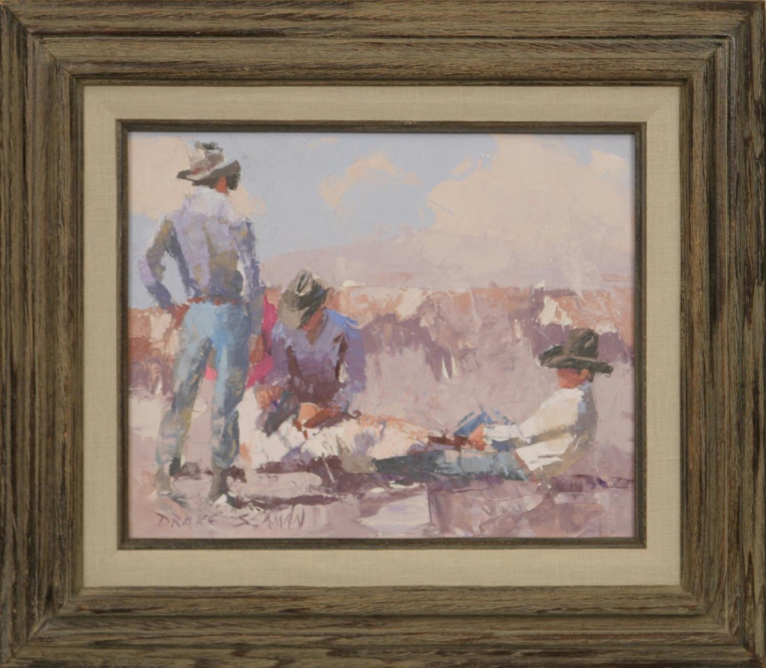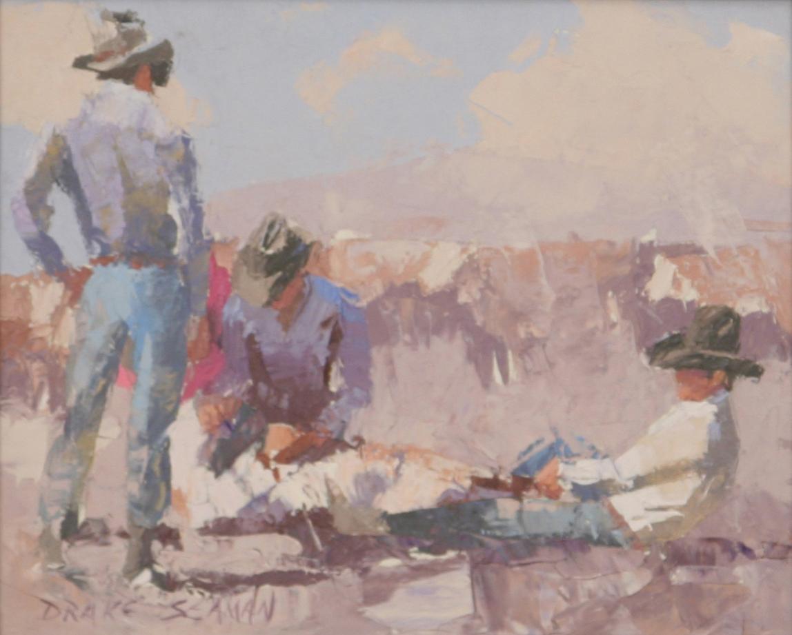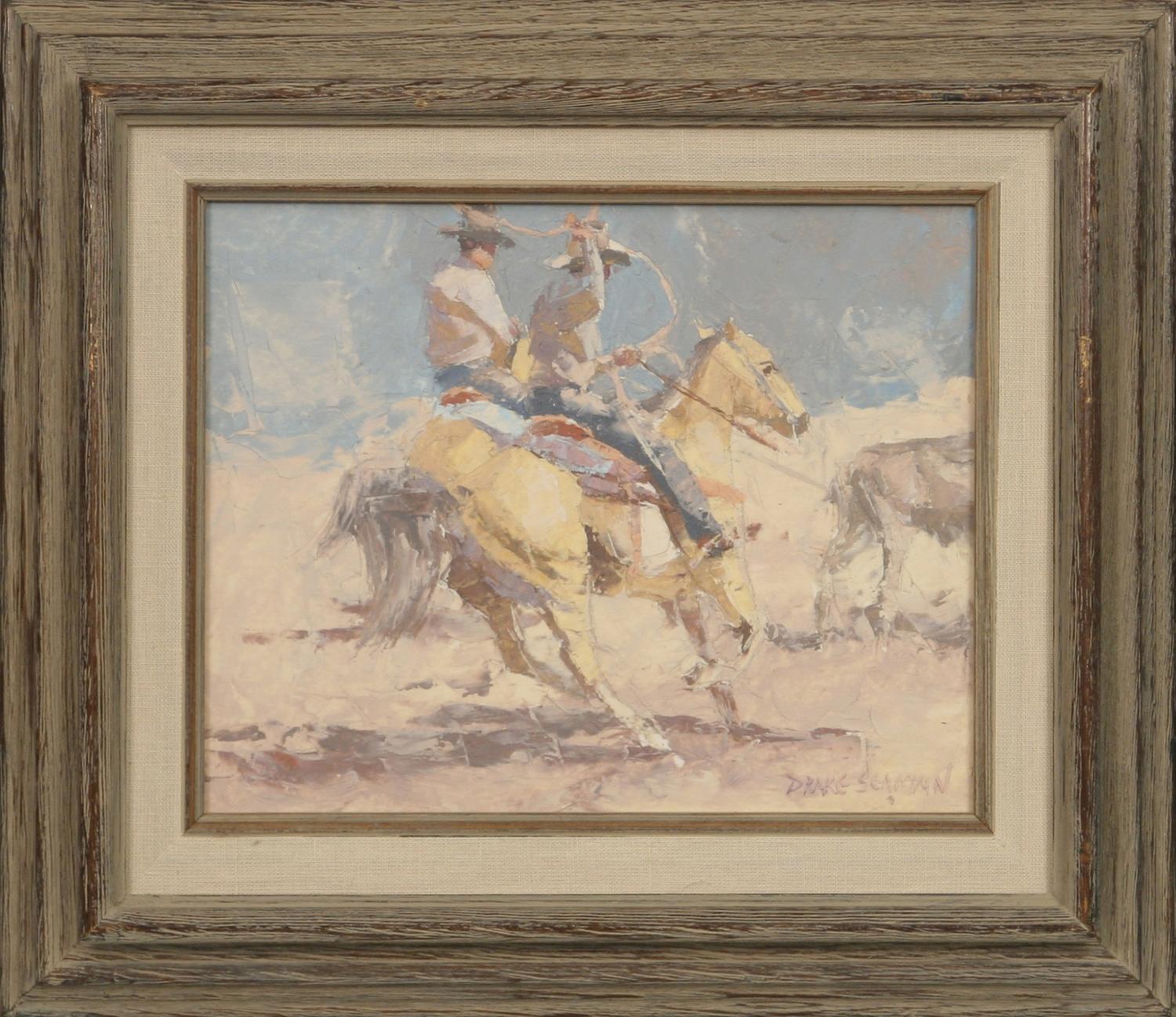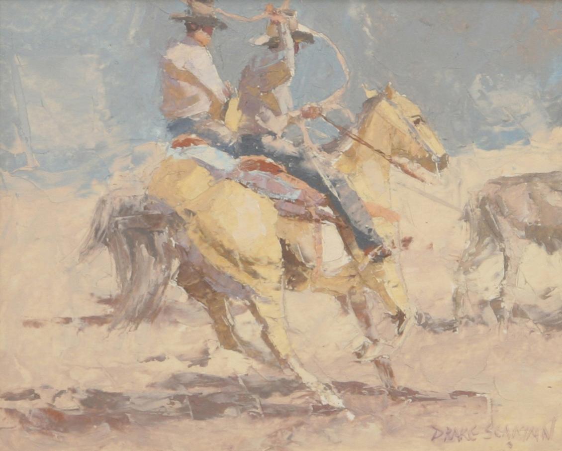 Drake Seaman (1935-2000). Pair of 8" x 10" Oil Paintings. (1) Ropers. signed lower right. (2) Somewhere on the Range. signed lower left. (est $1,000-1,500) Condition Report: Both black light clean