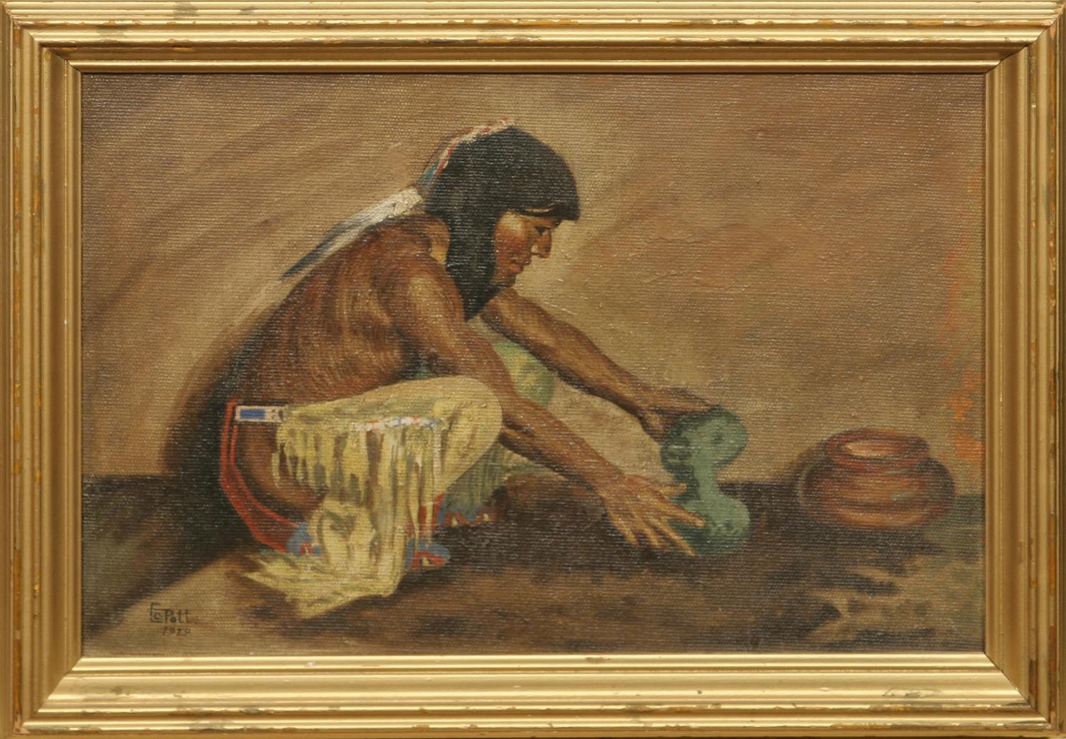 E. C. Pott (E. I. Couse School). Indian With Pottery. 19" x 13" oil on canvas. signed & dated 1919 lower left. with painting verso. (est $500-900) Condition Report: Paint has darkened with age, but black lights clean. Original frame