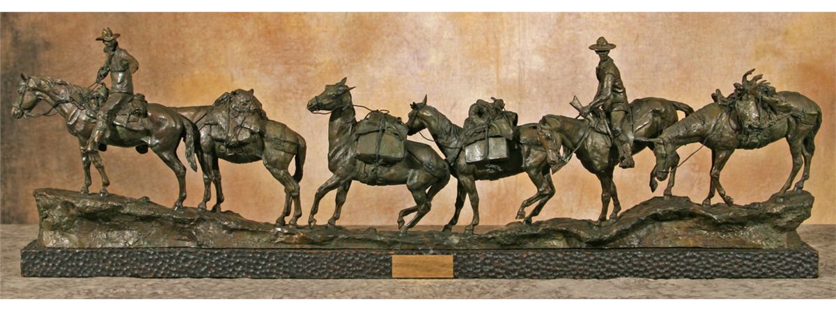 Earle E. Heikka (1910 - 1941). Trophy Hunters. 14.5" x 50" x 7" bronze. Inscribed: 11/24 TROPHY HUNTERS, -E. E. HEIKKA- © J. W. BOWMAN 1971. Marked: JHM CLASSIC BRONZE. Condition reports can be viewed at www.marchinmontana.com/docs/2013CR.pdf