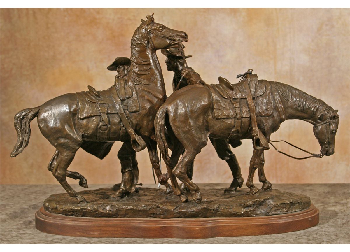 Earle E. Heikka (1910 - 1941). Changing Riders On The Pony Express. 15.5" x 23" x 8.5" bronze. Inscribed: E. E. Heikka -3. Marked: © H. METTLER CONS, J. G. STEVENS CONS 28/35 1976. Powell Bronze (Kalispell, Montana) medallion affixed. Condition reports can be viewed at www.marchinmontana.com/docs/2013CR.pdf