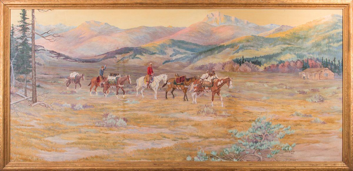 Earle E. Heikka (1910-1941). Pack Train. 43" x 92" oil on canvas. Signed and dated 1939 lower right. Provenance: Evel Knievel's Collection, to current owner Kelly Knievel, by descent. Hung in Eddie's Restaurant, Great Falls, in the '70s-'80s