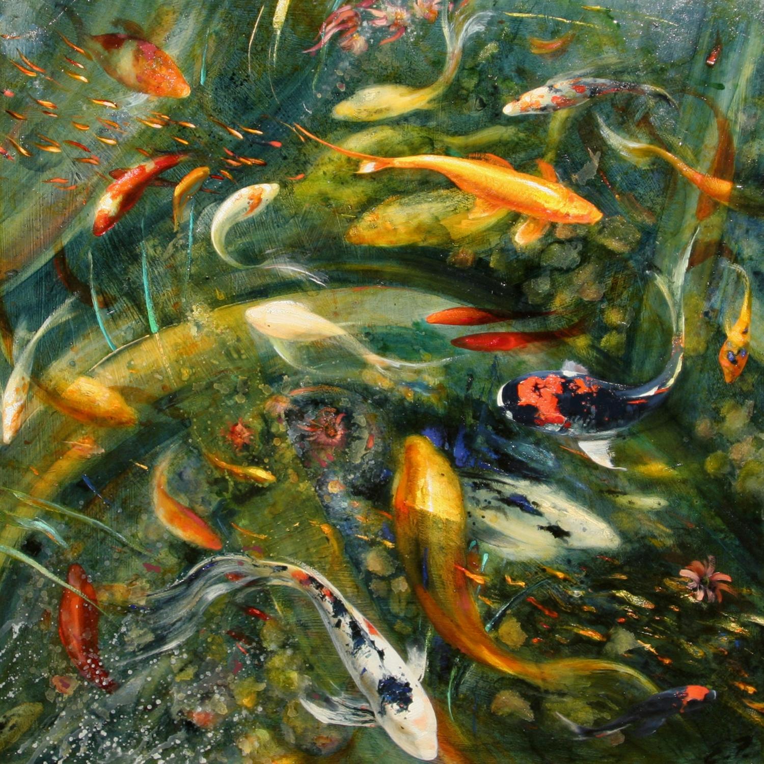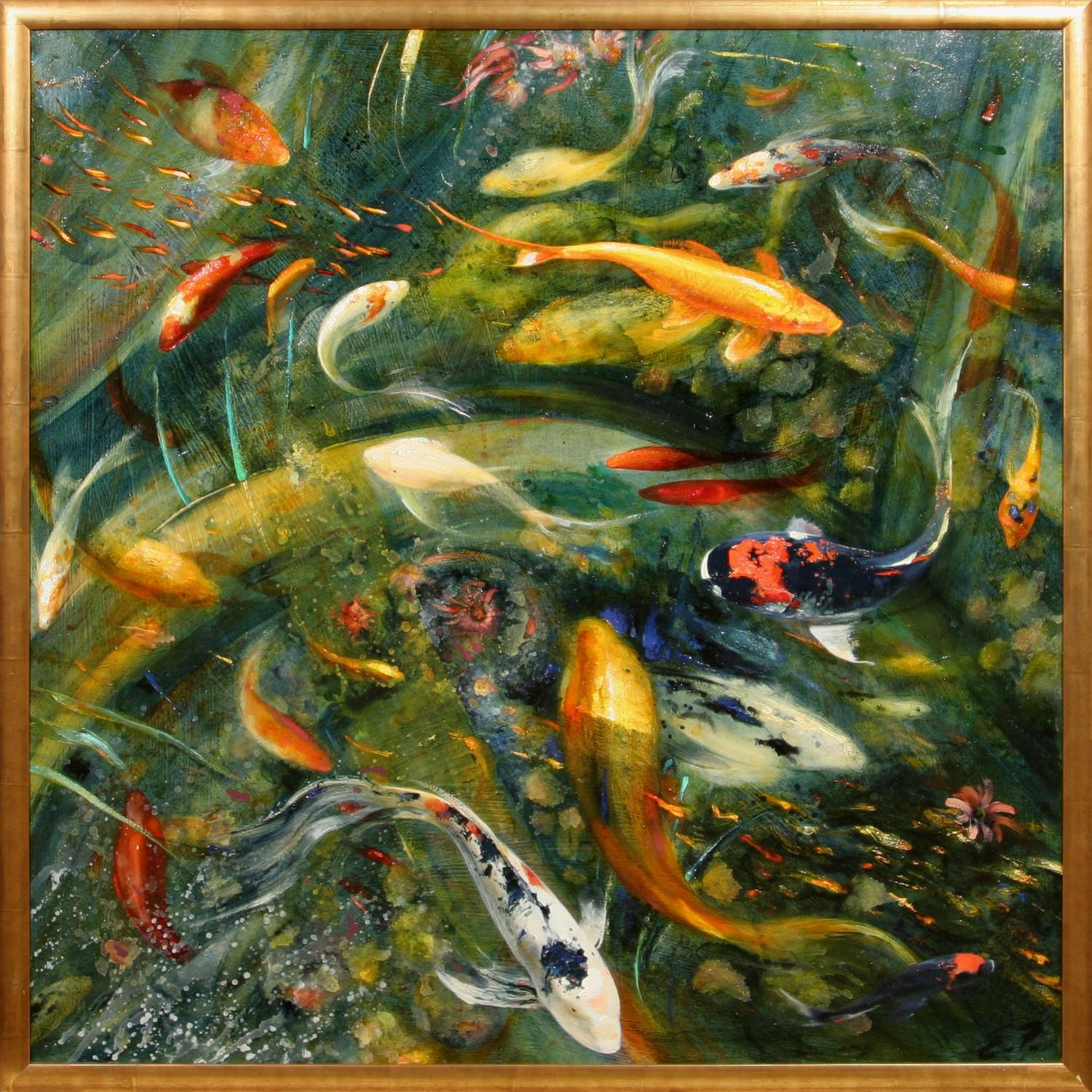 Ed Friedman (20th century). Koi. 48" x 48" oil on board. signed lower right. (est $6,000-8,000) Condition Report: Black lights clean. Modern frame