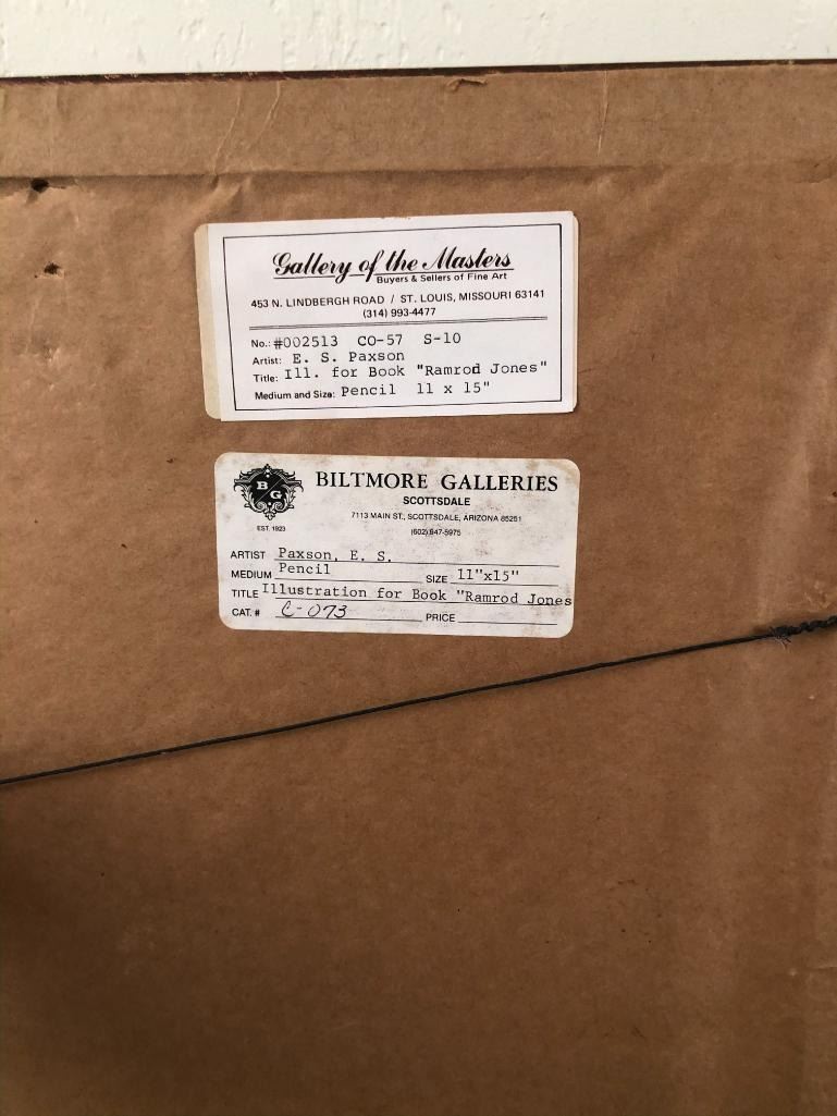 Edgar Paxson (1852-1919) "There, there, Sonny, don't be afraid, I ain't goin' to hurt yer." 19" x 13" watercolor illustration for the book Ramrod Jones by Clint Brown Signed and dated 1905 lower right $8,000-12,000 Provenance: 15" x 11" pencil sketch and hardcover copy of Ramrod Jones to accompany the lot. Illustration featured on first page of the book. Excerpt from the book: My uncle was a very hard and cruel man..."Yer lazy, good-for-nothing little thief," he said. "I'll learn yer. I'll shake the life out of yer."... "Git up an' take off your clothes", he said. "I'll give yer something yer'll never forgit." ...When I was stripped, I faced him. He picked up his stick...I did not cry out. I took it all with my eyes shut. I will not try to tell you how he beat me. I remember but little of it, except burning pains all over me, and the wild thought in my mind that I must not give way. His stick broke. He threw it down and lammed me on the side of the head with his open hand. It knocked me down. But I was soon up again, and looked at him stubbornly. He was plumb mad with anger. He rushed at me and raised his clenched fist. I had heard nothing behind me, and I do not suppose he had either, for each of us was all taken up in watching the other. He never hit me again. When his fist was raised above his head something struck him, and he gave a groan and fell in a heap before me. I looked around. A man was standing near us, leaning on his rifle. "There, there, Sonny," he said to me, "don't be afraid. I ain't a-goin' to hurt yer."