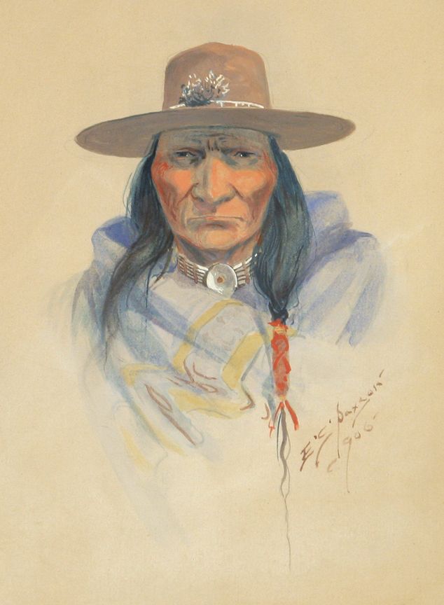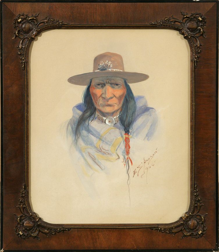 Edgar S. Paxson (1852 - 1919). Indian With Cowboy Hat. 11" x 10" watercolor. Signed lower right: E. S. Paxson 1906. Gallery tags verso from Gerald P. Peters of Santa Fe, NM., & Lockwood's Midwestern Galleries of Cincinnati, OH. Condition reports can be viewed at www.marchinmontana.com/docs/2013CR.pdf