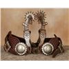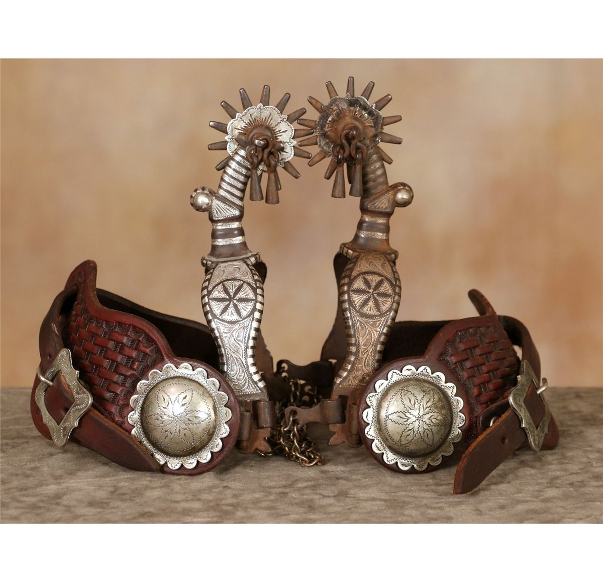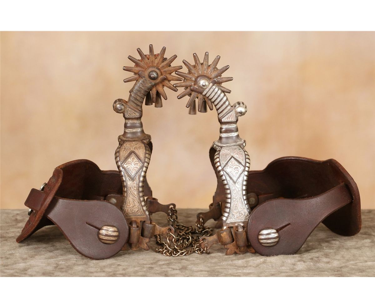 Eduardo Garcia Spurs. 7" overall length with 2.25" fourteen point rowels, Silver inlaid and engraved. Drop shank. Silver rowel protector. Swing buttons. Completed with jingle bobs and double chain tie downs. G. S. Garcia Dandy style. Marked E GARCIA. Two-piece basket stamped leathers with large silver conchos.