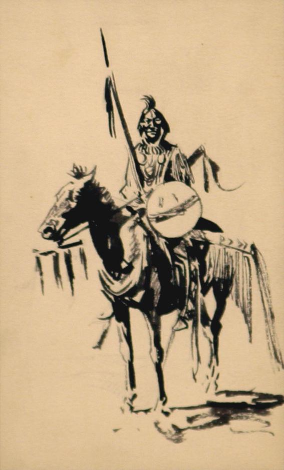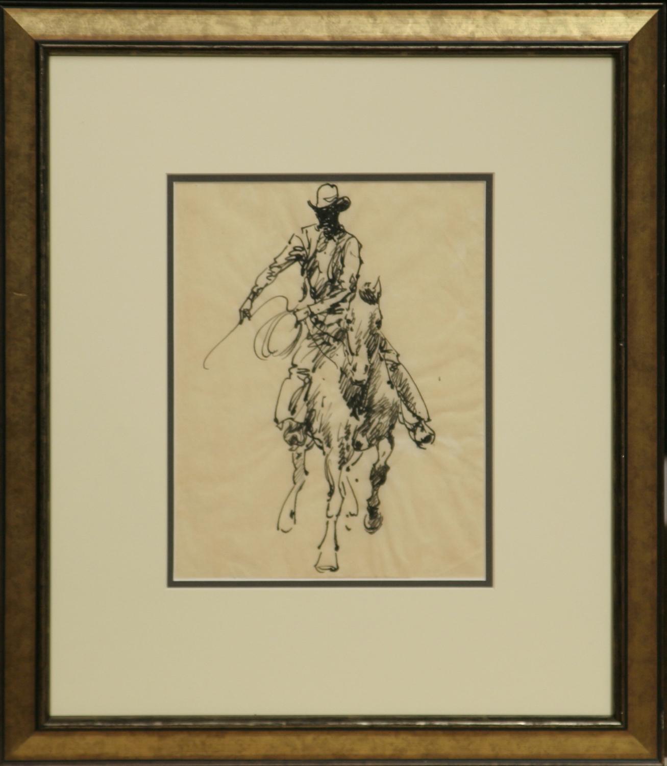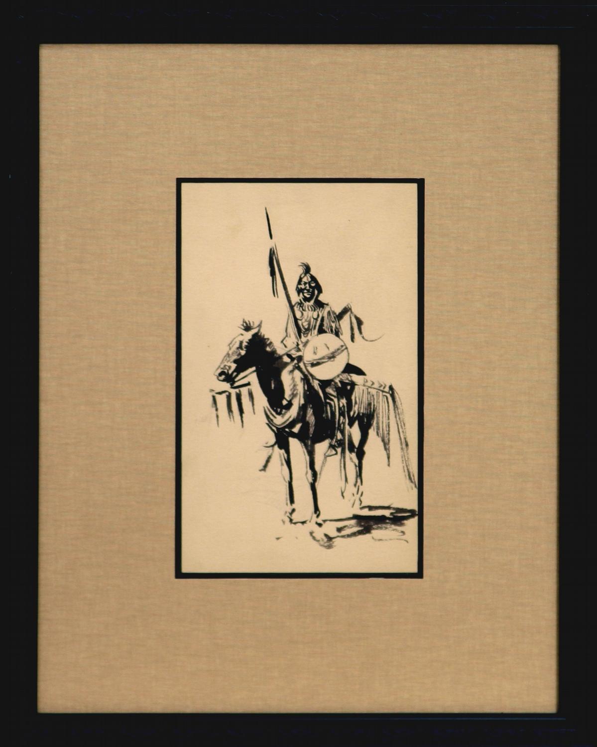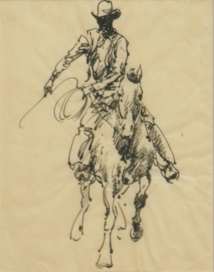 Edward Borein (1872-1945). Pair of Pen and Ink Drawings. (1) Riding High. 8 ¾" x 7". (2) Indian Brave. 8" x 4 ¾". Both unsigned. (est $1,000-2,000). . A letter of authentication from Marlene Miller will accompany this lot Condition Report: (1) Paper is a little wrinkled/wavey - as is common with Borein drawings-no actual damage. Both in fine condition