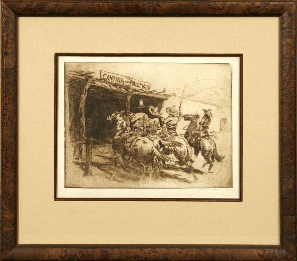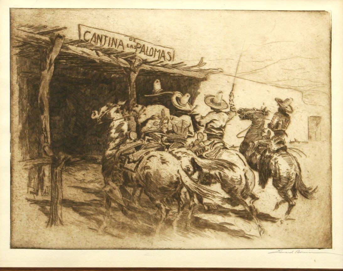 Edward Borein (1872 - 1945). La Cantina de Las Palomas, No. 2. 9" x 11.875" etching. Pencil signed lower right: Edward Borein. #271 The Etchings of Edward Borein by John Galvin. Condition reports can be viewed at www.marchinmontana.com/docs/2013CR.pdf